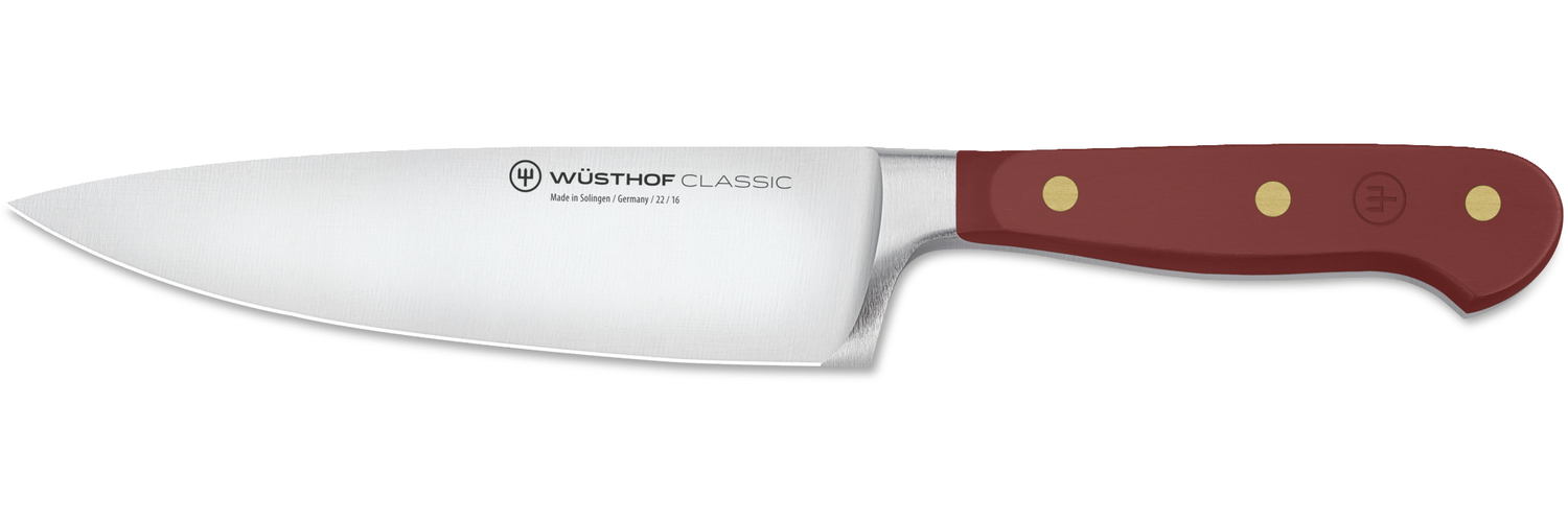 Das WÜSTHOF Classic Kochmesser mit einer Klingenlänge von 16 cm ist ein unverzichtbares Werkzeug für die Zubereitung frischer Lebensmittel. Mit seinem modernen, dunkel-roten Griff und den charakteristischen Messingnieten vereint es Tradition und zeitgemäßes Design. Das geschmiedete Messer aus einem Stück Edelstahl bietet mit 58° HRC eine hohe Stabilität und Sicherheit beim Schneiden, Hacken und Wiegen. **Highlights** - Klingenlänge: 16 cm für vielseitige Anwendungen - Moderner, farbiger Griff in Tasty Sumac (Dunkel-Rot) - Geschmiedet aus einem Stück Edelstahl für hohe Stabilität - 58° HRC für langanhaltende Schärfe - Tradition seit 1814 – Made in Germany **Produkteigenschaften** - Ergonomischer Griff für komfortables Arbeiten - Vollkropf-Design für sicheres Schneiden - Pflegehinweis: Nur von Hand reinigen - Messingnieten für einen klassischen Look - Ideal zum Wiegen, Hacken und Schneiden von Lebensmitteln