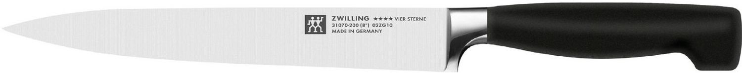 Zwilling Fleischmesser 200 mm aus der Vier Sterne Serie. Material: - aus rostfreiem Spezialstahl - Kunststoff Maße: - 200 mm (Klinge) Mit fugenlosem Kunstsstoffgriff. Ein hochwertiges schlankes Messer mit stabiler Klinge. Ideal zum Zerteilen. Schneiden und Tranchieren von Fleisch und Braten.