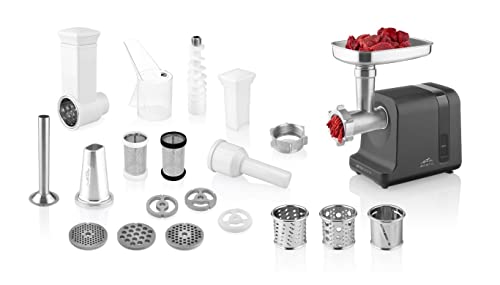 | Lieferumfang | - | Kebbe, Wurststopfer, Durchlaufschnitzler, 4 Trommeln, Fruchtpressenvorsatz | Stopfer, Kebbe, Durchlaufschnitzler, 2 Trommeln | Wurst-Füllvorsatz, Einfüllschale, Stopfer, Spritzgebäckvorsatz, Kebbevorsatz, 2 Lochscheiben | 3 Edelstahl Lochscheiben (fein, grob, mittel), 2 Wurstfüll-Aufsätze, 1 Kebbe-Aufsatz, große Einfüllschale aus Metall mit Abdeckhaube | Fleischwolf, Bedienungsanleitung, 2 Scheiben: 3,8 / 8 mm, Wurststopfer, Durchlaufschnitzler, 3 Trommeln | - | - | Fleischwolf, Gebäckvorsatz, Edelstahlmesser, Edelstahl-Lochscheibe | 3 Lochscheiben, Wurstaufsatz, herausnehmbarer Schneideteller | - | - | Wurstfülleraufsatz, Kebbeaufsatz | Kebbeaufsatz, Einfüllschale, Stopfer, Aufbewahrungssystem, Einfüllhilfe, Lochscheibe | 1 x WMF Profi Plus Fleischwolf3 x Lochscheiben aus Edelstahl (3 mm, 4 mm, 7 mm), 1 x Lochscheibenreiniger aus Silikon, 2 x Aufsätze für Würste, 1 x Aufsatz für Kebbe, 1 x Aufsatz für Spritzgebäck | - | 3 Lochscheiben (Ø 3 mm, Ø 5 mm, Ø 8 mm), Kebbevorsatz, Wurstfülltrichter, Spritzgebäckvorsatz, Stopfer | - | Fleischwolf, 3 Schneidscheiben aus Edelstahl (3/5/7 mm), Messer aus Edelstahl, Metzgerzubehör, Schredder mit 4 Trommeln, Schieber | 3 Metall-Lochscheiben (fein, mittel, grob), 4-flügeliges Edelstahlmesser, Kebbeaufsatz, Plätzchen-/Gebäckaufsatz, Wurstfülleraufsatz | 1 x Motoreinheit, 1 x Zubehörschublade, 1 x Vorratsschale, 1 x Stopfer, 1 x Wursttülle, 1 x Spritzgebäckaufsatz, 1 x Kebbe-Einsatz, 1 x Schneidklinge, 3x Lochscheibe, 1 x Feststellmutter, 1 x Förderschnecke, 1 x Fleischwolfaufsatz, 1 x Gebäckformschiene |