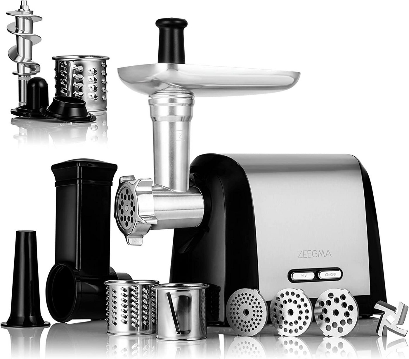 | Lieferumfang | 3 Schleifscheiben Größe 3/5/7 mm, Gemüseschneider mit drei Fässern, selbstschärfendes Edelstahlmesser, Metzgerzubehör, Kebbe Topper, eingebaute Zubehörbox | Kebbe, Wurststopfer, Durchlaufschnitzler, 4 Trommeln, Fruchtpressenvorsatz | Stopfer, Kebbe, Durchlaufschnitzler, 2 Trommeln | Wurst-Füllvorsatz, Einfüllschale, Stopfer, Spritzgebäckvorsatz, Kebbevorsatz, 2 Lochscheiben | 3 Edelstahl Lochscheiben (fein, grob, mittel), 2 Wurstfüll-Aufsätze, 1 Kebbe-Aufsatz, große Einfüllschale aus Metall mit Abdeckhaube | Fleischwolf, Bedienungsanleitung, 2 Scheiben: 3,8 / 8 mm, Wurststopfer, Durchlaufschnitzler, 3 Trommeln | - | - | Fleischwolf, Gebäckvorsatz, Edelstahlmesser, Edelstahl-Lochscheibe | 3 Lochscheiben, Wurstaufsatz, herausnehmbarer Schneideteller | - | - | Wurstfülleraufsatz, Kebbeaufsatz | Kebbeaufsatz, Einfüllschale, Stopfer, Aufbewahrungssystem, Einfüllhilfe, Lochscheibe | 1 x WMF Profi Plus Fleischwolf3 x Lochscheiben aus Edelstahl (3 mm, 4 mm, 7 mm), 1 x Lochscheibenreiniger aus Silikon, 2 x Aufsätze für Würste, 1 x Aufsatz für Kebbe, 1 x Aufsatz für Spritzgebäck | - | 3 Lochscheiben (Ø 3 mm, Ø 5 mm, Ø 8 mm), Kebbevorsatz, Wurstfülltrichter, Spritzgebäckvorsatz, Stopfer | - | Fleischwolf, 3 Schneidscheiben aus Edelstahl (3/5/7 mm), Messer aus Edelstahl, Metzgerzubehör, Schredder mit 4 Trommeln, Schieber | 3 Metall-Lochscheiben (fein, mittel, grob), 4-flügeliges Edelstahlmesser, Kebbeaufsatz, Plätzchen-/Gebäckaufsatz, Wurstfülleraufsatz | 1 x Motoreinheit, 1 x Zubehörschublade, 1 x Vorratsschale, 1 x Stopfer, 1 x Wursttülle, 1 x Spritzgebäckaufsatz, 1 x Kebbe-Einsatz, 1 x Schneidklinge, 3x Lochscheibe, 1 x Feststellmutter, 1 x Förderschnecke, 1 x Fleischwolfaufsatz, 1 x Gebäckformschiene |