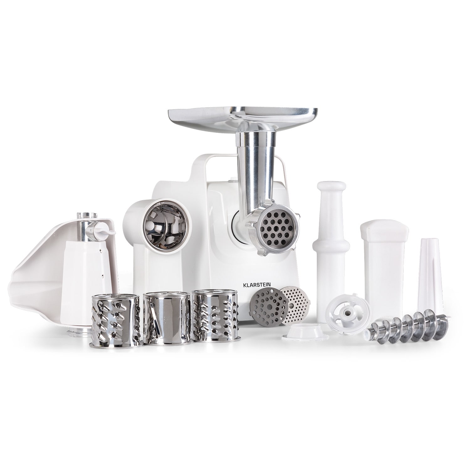 | Lieferumfang | 1 x Fleischwolf inkl. Aluminium-Schale & Stopfer, 3 x Edelstahl-Lochscheibe (grob / mittel / fein), 1 x Edelstahl-Flügelmesser, 1 x Kopf mit Schnecke, 1 x Aufsatz zur Wurstherstellung, 1 x Kebbe-Aufsatz, 1 x Pürieraufsatz mit Schnecke und Auffangschale, 1 x Kopf für Gemüsereibe mit Stopfer, 3 x Reibeeinsätze für Gemüse, mehrsprachiger Bedienungsanleitung |