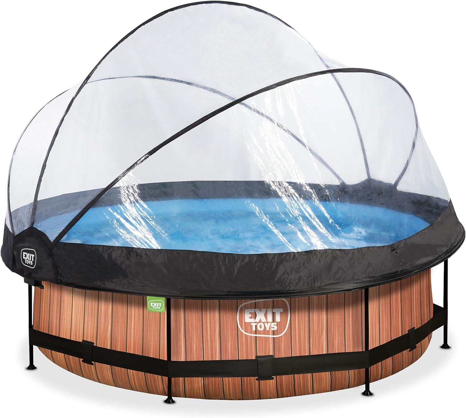 Der Exit Rundpool Swimming-Pool inkl. Überdachung Wood Braun, 300x76 cm, ist der perfekte Pool für alle Wetterlagen. Der robuste Stahlrahmen ist galvanisiert und pulverbeschichtet, was ihm optimale Stabilität verleiht. Die 3-lagige Wand aus PVC und Polyester macht den Pool äußerst widerstandsfähig. Mit seinem stilvollen Design in brauner Holzoptik und der blauen Innenseite des Beckens sorgt er für ein Schwimmbad-Gefühl im eigenen Garten. Die transparente Poolabdeckung schützt vor Schmutz und erwärmt das Wasser nachhaltig. Die mitgelieferte Filterpumpe hält das Wasser sauber und in Bewegung. Der Lieferumfang umfasst den Pool, die Abdeckung, die Filterpumpe, den Liner und ein Reparatur-Set. Der Pool ist für Kinder ab 6 Jahren geeignet und EN71 zertifiziert. Nur für den Hausgebrauch geeignet. **Highlights** - Stabile Konstruktion für optimale Stabilität - Widerstandsfähige PVC und Polyester Wände für hohe Langlebigkeit - Einzigartiges Pooldach ermöglicht Nutzung bei schlechtem Wetter - Benutzerfreundliche Handhabung der Abdeckung - Naturgetreue Reinigung durch Filterpumpe **Produkteigenschaften** - Abmessungen: 300x76 cm - Material: Stahlrahmen, PVC und Polyester Wände - Farbe: Braun (Holzoptik) mit blauer Innenseite des Beckens - Altersempfehlung: ab 6 Jahren - Zertifizierung: EN71 **Lieferumfang** - EXIT Frame Swimming-Pool - Inkl. Abdeckung - Inkl. Filterpumpe - Liner - Reparatur-Set