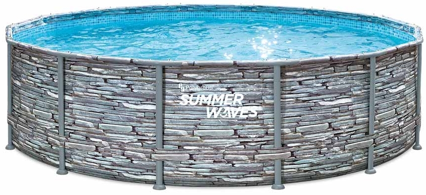 | Beschreibung | Der Summer Waves Elite Frame Pool ist der ideale Aufstellpool für unvergessliche Sommertage. Mit einem Durchmesser von 427 cm und einer Höhe von 107 cm bietet er Platz für bis zu 6 Personen. Der Pool überzeugt durch seine robuste Stahlrohr-Konstruktion und die strapazierfähige 3-lagige PVC-Polyester-Mix Folie. Dank des innovativen Snap-in Systems ist der Aufbau schnell und unkompliziert. Genießen Sie kristallklares Wasser mit der mitgelieferten Skimmer Plus 2-in-1 Filterpumpe. **Highlights** * Komplettset mit exklusivem Zubehör * Robuste Poolkonstruktion für langanhaltenden Badespaß * Maximale Stabilität durch massive Stahlrohr-Konstruktion * Hohe Belastbarkeit dank 3-lagiger PVC-Polyester-Mix Folie * Schneller und einfacher Aufbau durch Snap-in Verfahren **Produkteigenschaften** * Maße (Ø x H): 427x107 cm * Füllmenge bei 90 %: 13.294 Liter * Platz für ca. 6 Personen * Material: 3-lagiger PVC-Polyester-Mix * Attraktives Design in Steinoptik mit Mosaikmuster **Lieferumfang** - * Skimmer Plus Filterpumpe mit Filterpatrone * Einstiegsleiter * Abdeckplane und Bodenvlies * Deluxe-Reinigungsset |