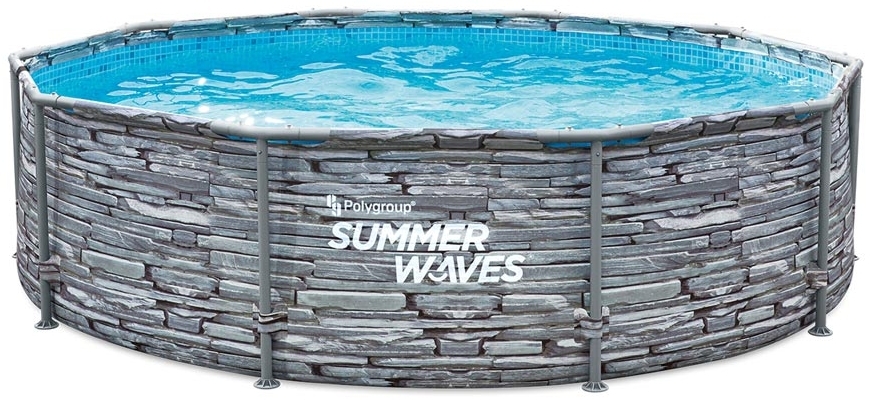 Beschreibung Der Summer Waves Active Frame Pool ist ein runder Aufstellpool in Grau mit den Abmessungen 305 x 305 x 76 cm. Dank des innovativen Snap-in Systems ist der Aufbau schnell und unkompliziert. Die robuste Konstruktion aus beschichtetem Metall und die strapazierfähige Poolfolie aus 3-lagigem PVC-Polyester-Mix sorgen für Langlebigkeit und Stabilität. Mit einer Füllmenge von 4.792 Litern bietet der Pool Platz für bis zu 5 Personen und garantiert erfrischenden Badespaß. **Highlights** - Robuste Poolkonstruktion - Schneller Aufbau durch Snap-in Verfahren - Poolfolie aus 3-lagigem PVC-Polyester-Mix - Füllmenge bei 90 %: 4.792 Liter - Platz für bis zu 5 Personen **Produkteigenschaften** - Rahmenrohre aus beschichtetem Metall - Mosaik Innenseite **Lieferumfang** - Skimmer Plus 2-in-1 Filterpumpe mit Abschöpftechnologie - Filterpatrone 4895215107585