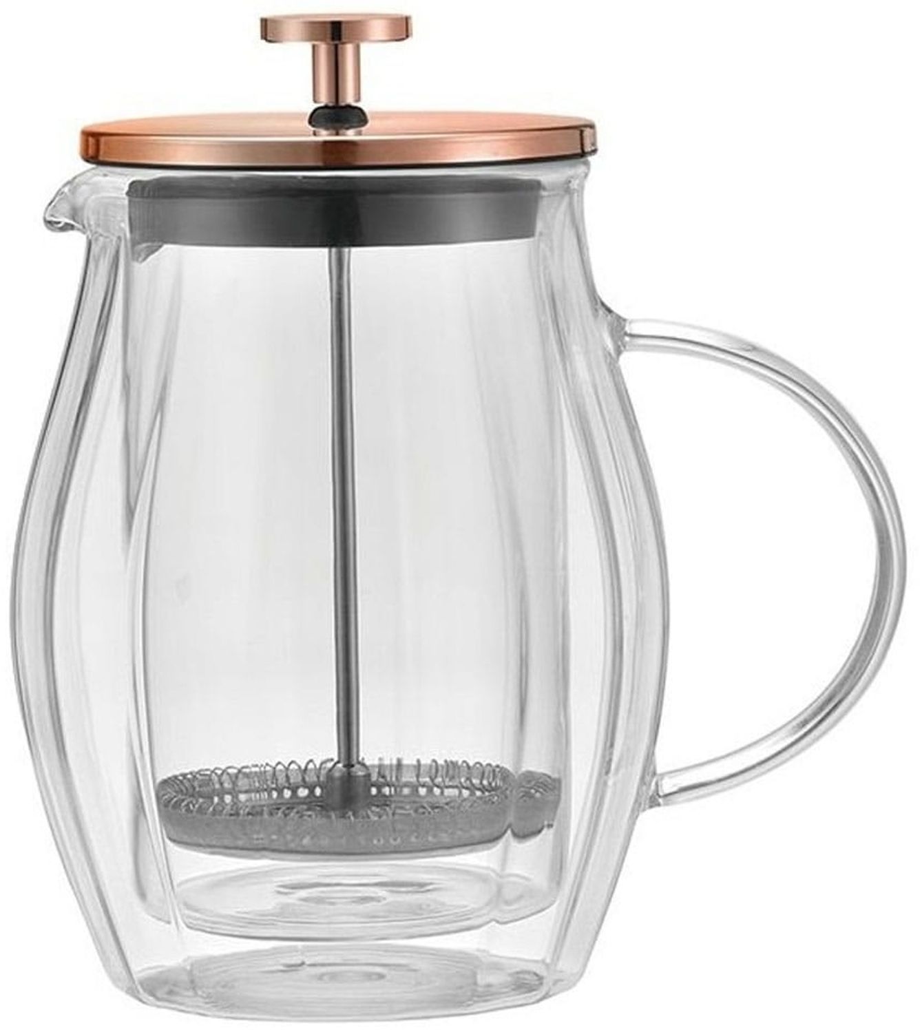 Klausberg Kaffee- und Teezubereiter 0,60 Liter French Press KB7722 vereint Funktionalität und Stil. Hergestellt aus hochwertigem, doppeltem Borosilikatglas, bietet er hohe Widerstandsfähigkeit und Hitzebeständigkeit. Mit einem modernen Design in Silber und einem Roségold-Deckel ist er ideal für die Zubereitung von aromatischem Kaffee und frisch aufgebrühtem Tee. Die Spülmaschinenfestigkeit sorgt für eine einfache Reinigung. **Highlights** - Erstklassiges doppeltes Borosilikatglas für hohe Widerstandsfähigkeit und Hitzebeständigkeit - Fortschrittliches Filtersystem für einen klaren Aufguss - Vielseitige Anwendung für Zuhause, Büro und unterwegs - Auffälliges Design mit Roségold-Deckel - Spülmaschinengeeignet für einfache Reinigung **Produkteigenschaften** - Farbe: Silber / Roségold - Gewicht: 1200 g - Inhalt: 0,6 l (ca. 5 Tassen) - Material: Stahl - Produkttyp: Tee Eier - Sorte: von Hand