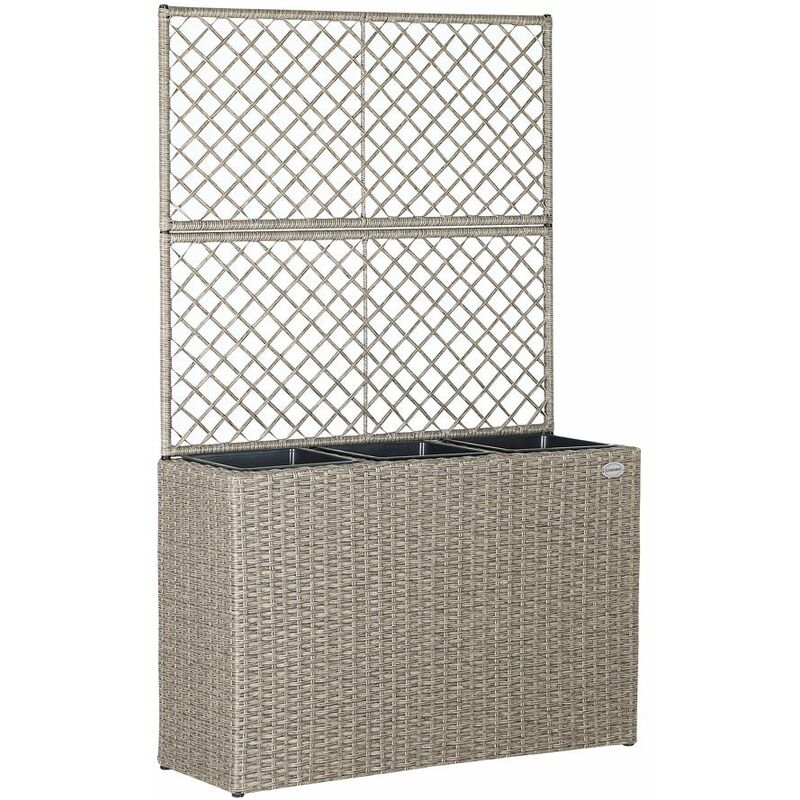 Der Blumenkasten mit Rankgitter aus handgewobenem Polyrattangeflecht bietet eine praktische und stilvolle Möglichkeit, Pflanzen zu präsentieren und gleichzeitig Platz zu sparen. Die drei herausnehmbaren Innentöpfe ermöglichen es, verschiedene Blumen oder Kräuter individuell zu arrangieren und einfach zu pflegen.