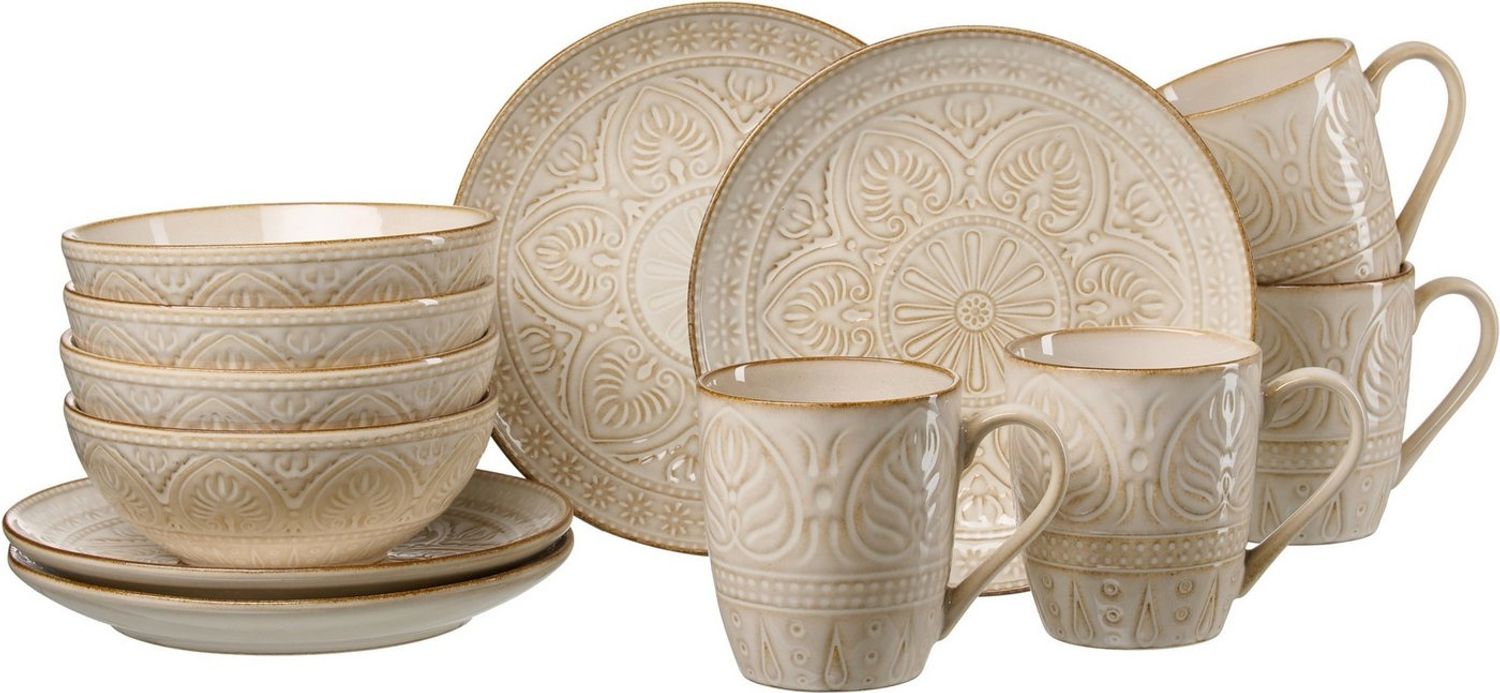 Das Ritzenhoff & Breker Omara Frühstücks-Set ist eine 12-teilige Geschirr-Serie, die für bis zu 4 Personen geeignet ist. Es umfasst 4 Kaffeebecher mit einem Fassungsvermögen von 400 ml, 4 Teller mit einem Durchmesser von 21 cm und 4 Müslischalen mit einem Durchmesser von 15,5 cm. Die prachtvolle Relief-Ornamentik und die schlichten Sandtöne verleihen diesem Steingut-Geschirr ein orientalisches Flair. Jedes Stück ist durch die Reaktivglasur ein Unikat. **Highlights** - 12-teiliges Set für bis zu 4 Personen - 4 Kaffeebecher mit 400 ml Fassungsvermögen - 4 Teller mit einem Durchmesser von 21 cm - 4 Müslischalen mit einem Durchmesser von 15,5 cm - Einzigartige Optik durch Reaktivglasur **Produkteigenschaften** - Material: Steingut - Farbton: Schlichte Sandtöne - Design: Prachtvolle Relief-Ornamentik - Spülmaschinenfest: Ja - Mikrowellengeeignet: Ja **Lieferumfang** - 4 Kaffeebecher (400 ml) - 4 Teller (Ø 21 cm) - 4 Müslischalen (Ø 15,5 cm)