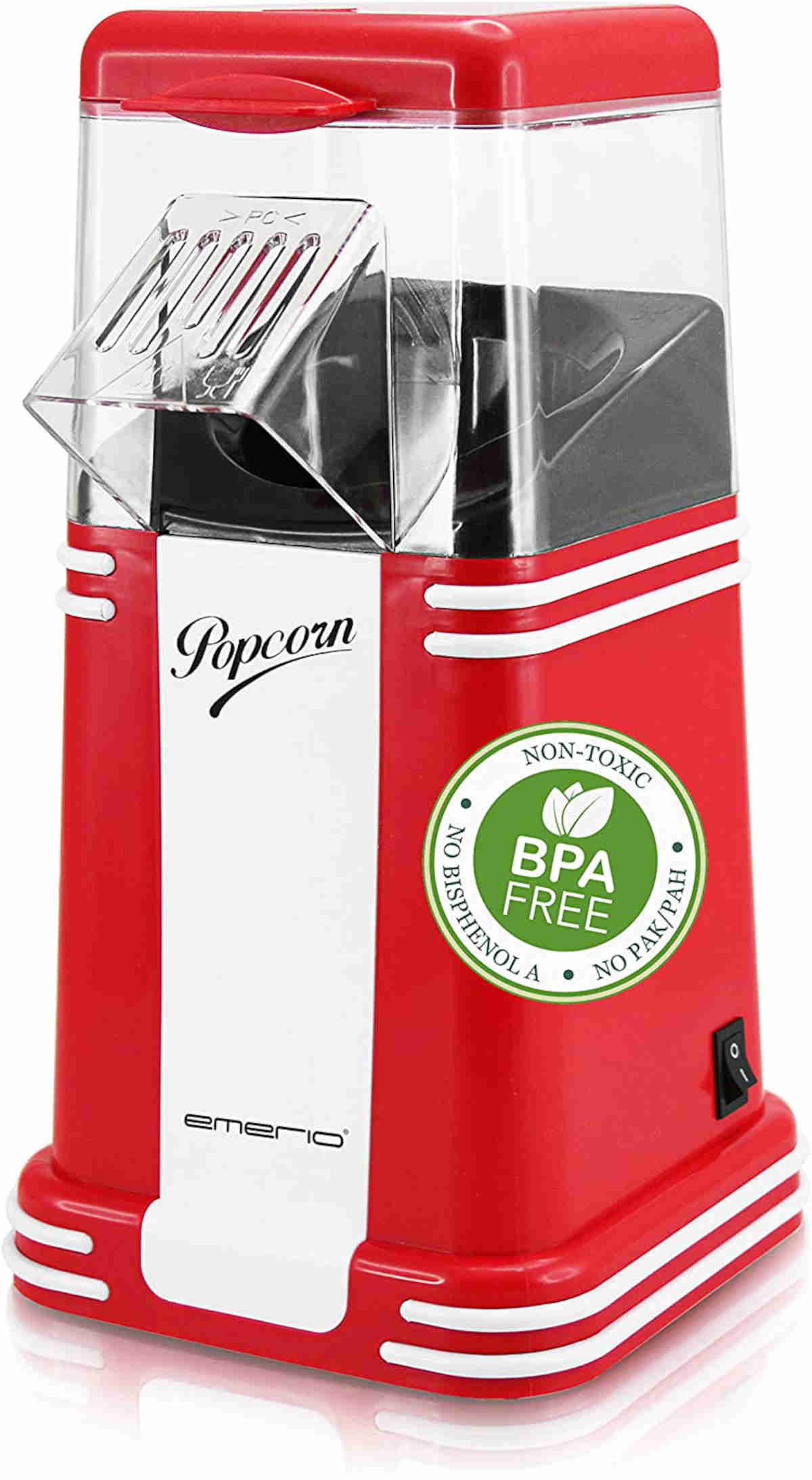 Die Emerio POM-111241 Popcorn-Maschine bereitet schnell und einfach fettfreies Popcorn zu. Sie funktioniert mit Heißluft und liefert knusprige Ergebnisse. Allerdings ist das Gerät laut, wird schnell warm und einige Maiskörner bleiben ungepoppt. Zudem muss man zwischen den Portionen eine Wartezeit einhalten und kann während des Poppens keine weiteren Zutaten hinzufügen.