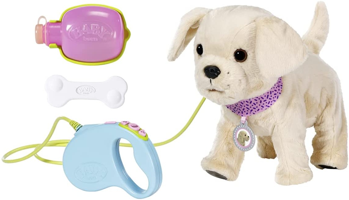 | Name | BABY born 'My Lucky Dog' Funktionsplüsch, ab 3 Jahren, inkl. Halsband mit Anhänger, Leine, Flasche mit Trinknapf und Knochen |