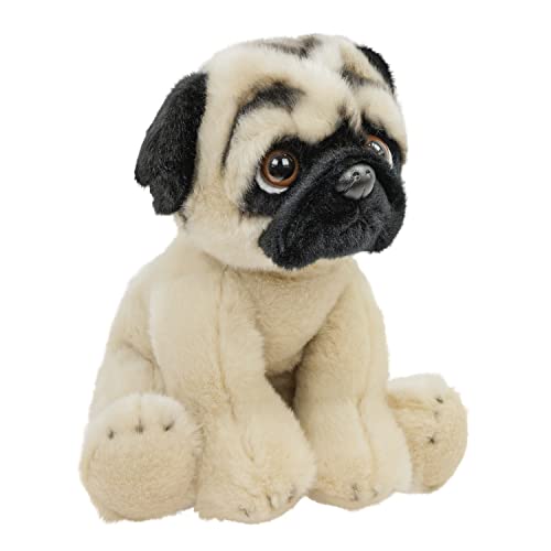 • Ein niedliches Kuscheltier in Form eines sitzenden Mops-Hundes, 30 cm groß und in den Farben Beige und Schwarz erhältlich