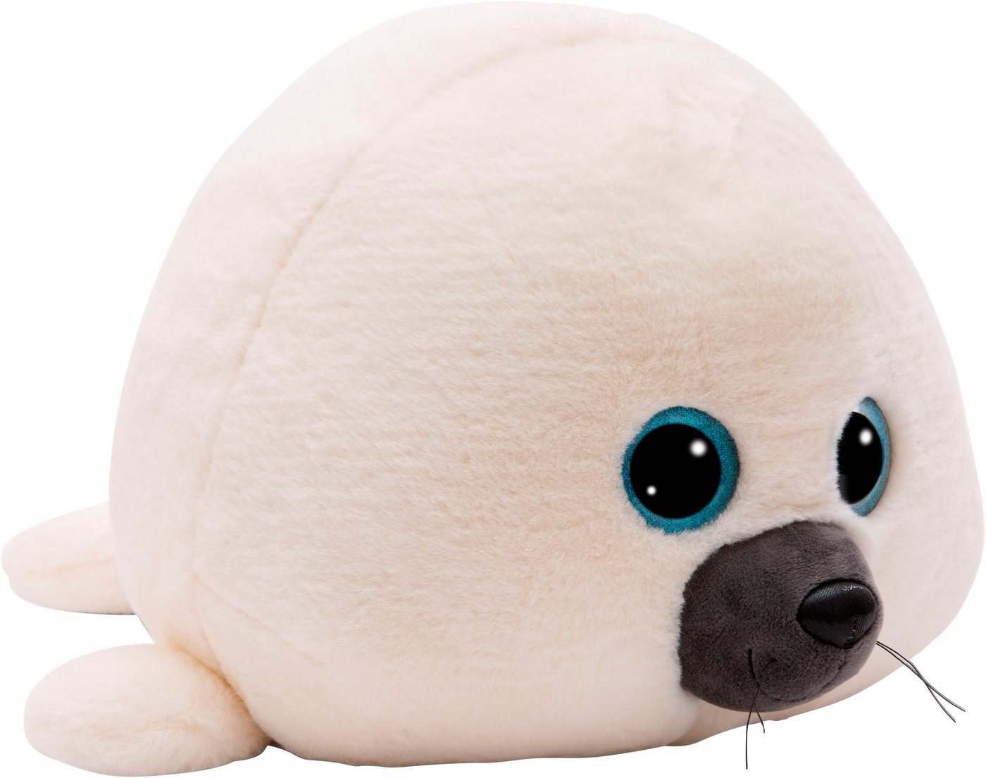Nici Kuscheltier GlubschisRobbe Boubelle, 45 cm, liegend - Flauschiges Seehund-Kuscheltier aus hochwertigem Plüsch, mit großen blauen Glitzeraugen, cremefarbenem Körper und stabilisierenden seitlichen Flossen