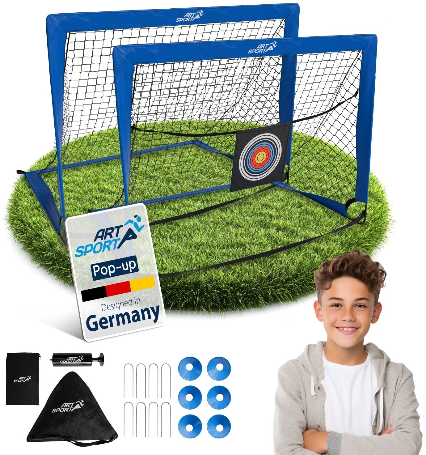Entfesseln Sie den Fußballspaß mit dem 2er Set Pop-up Fußballtor Goal Master in Blau! Das Tor mit Zubehör ist der perfekte Begleiter für spontane Spiele im Garten, Park oder am Strand. Dank des cleveren Pop-up-Designs lässt es sich in Sekundenschnelle aufstellen und ebenso schnell wieder verstauen - ideal für unterwegs. Die robuste Konstruktion sorgt für Stabilität und Langlebigkeit. Für alle Altersgruppen geeignet, bietet das Set vielfältige Trainingsmöglichkeiten. Kicken Sie, wann und wo Sie wollen – mit dem Fußballtor sind Sie immer bereit für das nächste Spiel. **Produktmerkmale:** - Set aus 2 Toren blitzschnell aufgestellt & sofort spielbereit - Ultraleicht, überallhin mitnehmbar im Garten & auf Reisen - Robustes Spiel für langanhaltenden Freizeitspaß - Indoor & Outdoor - Fußballtore mit Tornetze kompakt faltbar & platzsparend verstaubar - Perfekt für spontanes Fußballtraining - jederzeit & überall **Flexible Pop-up-Funktion** Die Fußballtore sind nicht nur schnell auf- und abbaubar, sondern bieten Ihnen auch die Freiheit, überall zu trainieren, wie auf dem Rasen oder Asphalt. Ultimativer Spaß beim Fußballspielen! **Robustes Material** Für langen Freizeitspaß bestehen die 2 Fußball-Tore und Tornetze aus Fiberglas, Oxford 420D-Gewebe und Polyester. Das bietet Langlebigkeit und Widerstandsfähigkeit. Mit den Erdnägeln steht jedes Tor sicher. **Platzsparend & mobil** Die zwei Mini Tore sind platzsparend zusammenklappbar und einfach in der Tragetasche und im Rucksack zu verstauen - ideal für unterwegs. Die Tore für das Training sind immer mit dabei. **Umfangreiches Zubehör** Zusätzlich erhalten Sie Zubehör wie Pumpe, Zielscheibe, Anti-Rutsch-Pad und Trainingskegel, um das Training noch abwechslungsreicher zu gestalten. Ein aufregendes Erlebnis für Groß und Klein! **Vielseitiges Fußballtraining** Bringen Sie Ihr Spiel auf das nächste Level! Ob Zielschuss-, Koordinationstraining oder einfaches Freizeitspiel - Kinder und Erwachsene haben gleichermaßen Spaß am Fußball. **Technische Daten:** - Marke: ArtSport - Farbe: Blau - Einsatzbereich: Garten, Park, Strand, Trainingsplatz - Geeignet für: Zielschusstraining, Freizeitspiele, Koordinationstraining - Zubehör: Luftpumpe, Hütchen, Zielscheiben, Erdnägel, Anti-Rutsch-Pad **Materialzusammensetzung:** - Gestell: Fiberglas - Netz: Polyester-Mesh, Oxford 420D - Zielscheiben: Oxford-Gewebe | Grau | Blau | Rot - Tasche + Rucksack: Oxford 420D **Abmessungen (ca.-Angaben):** - Größe Tor (BxHxT): 120 x 90 x 90 cm - Netzgittergröße: 5x5 cm - Fiberglasstäbe: Ø 7 mm - Zielscheiben: 25x25 cm - Rucksack (BxH): 37x45 cm **Lieferumfang:** - 2 x Pop-up Fußballtor - 1 x Transporttasche - 1 x Rucksack - 1 x umfassendes Zubehör - 1 x Anleitung Das Produkt wird gut verpackt als Bausatz zur Selbstmontage per Paketdienst geliefert.