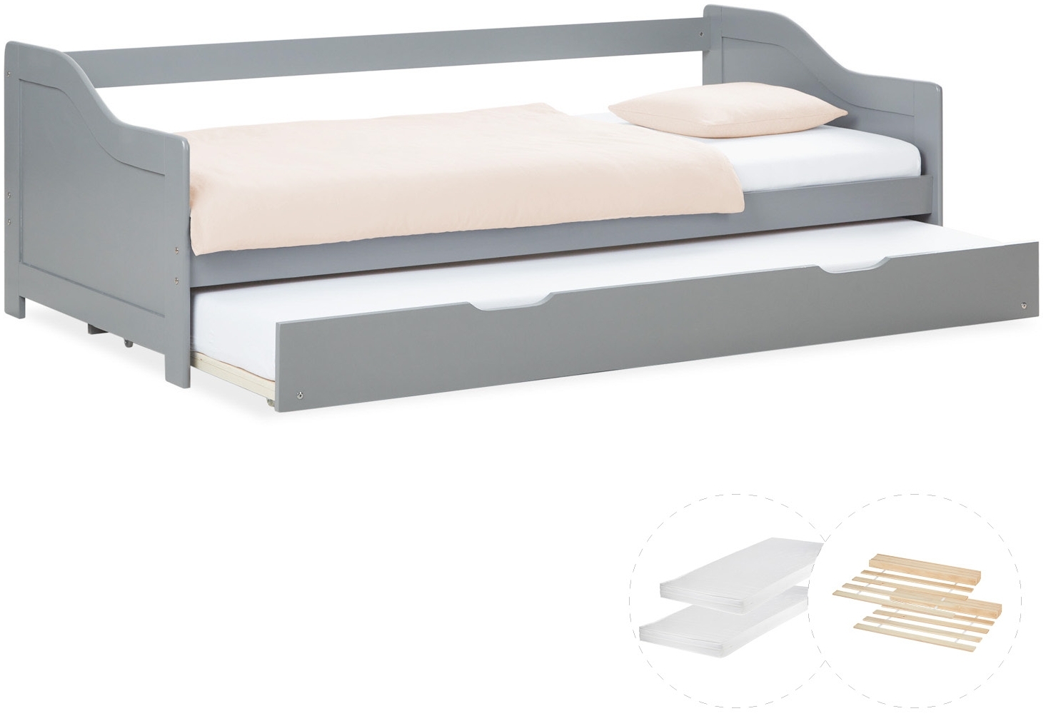Dieses moderne Ausziehbett in stilvollem Grau bietet eine praktische Lösung für Übernachtungsgäste und ist ideal für Kinderzimmer, Gästezimmer oder Jugendzimmer. Mit einer Liegefläche von 90x200 cm und zwei bereits enthaltenen Rollmatratzen (Härtegrad 2) ist es sofort einsatzbereit. Die stabile Konstruktion aus massivem Kiefernholz sorgt für hohe Belastbarkeit und Sicherheit. Das platzsparende Design ermöglicht eine einfache Handhabung und passt sich verschiedenen Einrichtungsstilen an. **Highlights** - Ausziehfunktion für zusätzliche Schlafmöglichkeit - Inklusive zwei Rollmatratzen und Lattenrosten - Stabile Konstruktion aus massivem Kiefernholz - Pflegeleichte Oberfläche - Geeignet für Allergiker **Produkteigenschaften** - Maße (BxHxT): 97,5 x 66 x 206 cm - Liegefläche: 90x200 cm - Bettkantenhöhe: 31 cm - Höhe Front Bettauszug: 19 cm - Höhe Seitenteil: 66 cm (hinten) | 53 cm (vorn) - Einlegetiefe Matratze: 3,5 cm - Materialstärke: 20 mm - Maße je Matratze (BxHxT): 90 x 11 x 200 cm - Farbe: grau **Lieferumfang** - Ausziehbett mit Matratzen - Aufbauanleitung - Montagezubehör - Bettwäsche und Dekoration sind nicht im Lieferumfang enthalten - Das Bett wird zerlegt geliefert und muss montiert werden