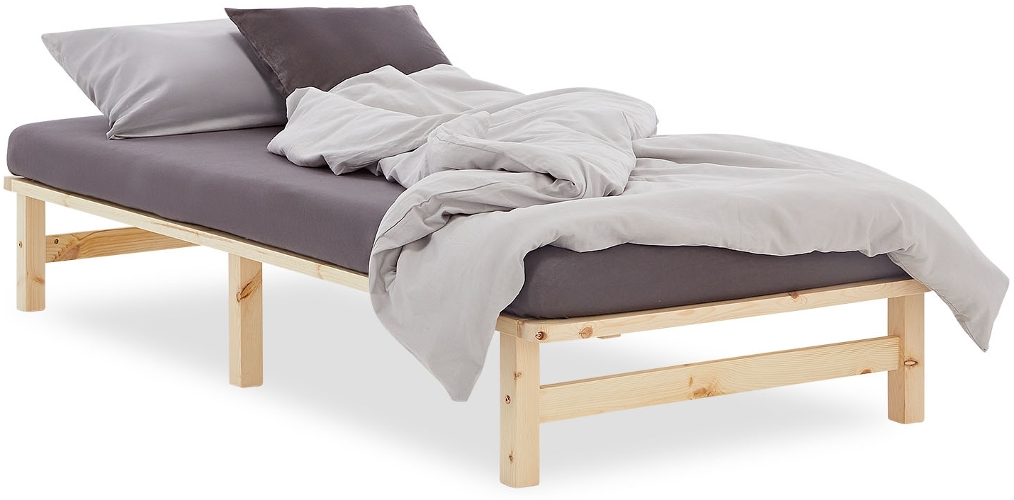 Dieses stilvolle Palettenbett aus naturbelassenem Massivholz vereint zeitloses Design mit natürlicher Wärme und schafft eine einladende Atmosphäre. Mit einer großzügigen Liegefläche von 100 x 200 cm bietet es ausreichend Platz für erholsame Nächte. Die offene Lattenkonstruktion sorgt für eine optimale Belüftung der Matratze und ein angenehmes Schlafklima. Die hochwertige Verarbeitung garantiert Langlebigkeit und die einfache Montage ermöglicht einen schnellen Aufbau. **Highlights** - Liegefläche: 100 x 200 cm für ausreichend Platz - Offene Lattenkonstruktion für optimales Schlafklima - Robuste Konstruktion aus naturbelassenem Massivholz - Schnelle und einfache Montage - Maximale Belastung von 120 kg **Produkteigenschaften** - Außenmaße (BxHxT): 100 x 28 x 200 cm - Oberkante Bettseite: 28 cm - Stauhöhe unter dem Bett: 25 cm - Materialstärke: 30 mm - Pfostenstärke: 4,8 cm - Farbe: natur **Lieferumfang** - Holzbettrahmen mit Lattenrost - Aufbauanleitung - Montagezubehör - Dekoration und Matratze sind nicht im Lieferumfang enthalten - Das Bett wird zerlegt geliefert und erfordert Montage