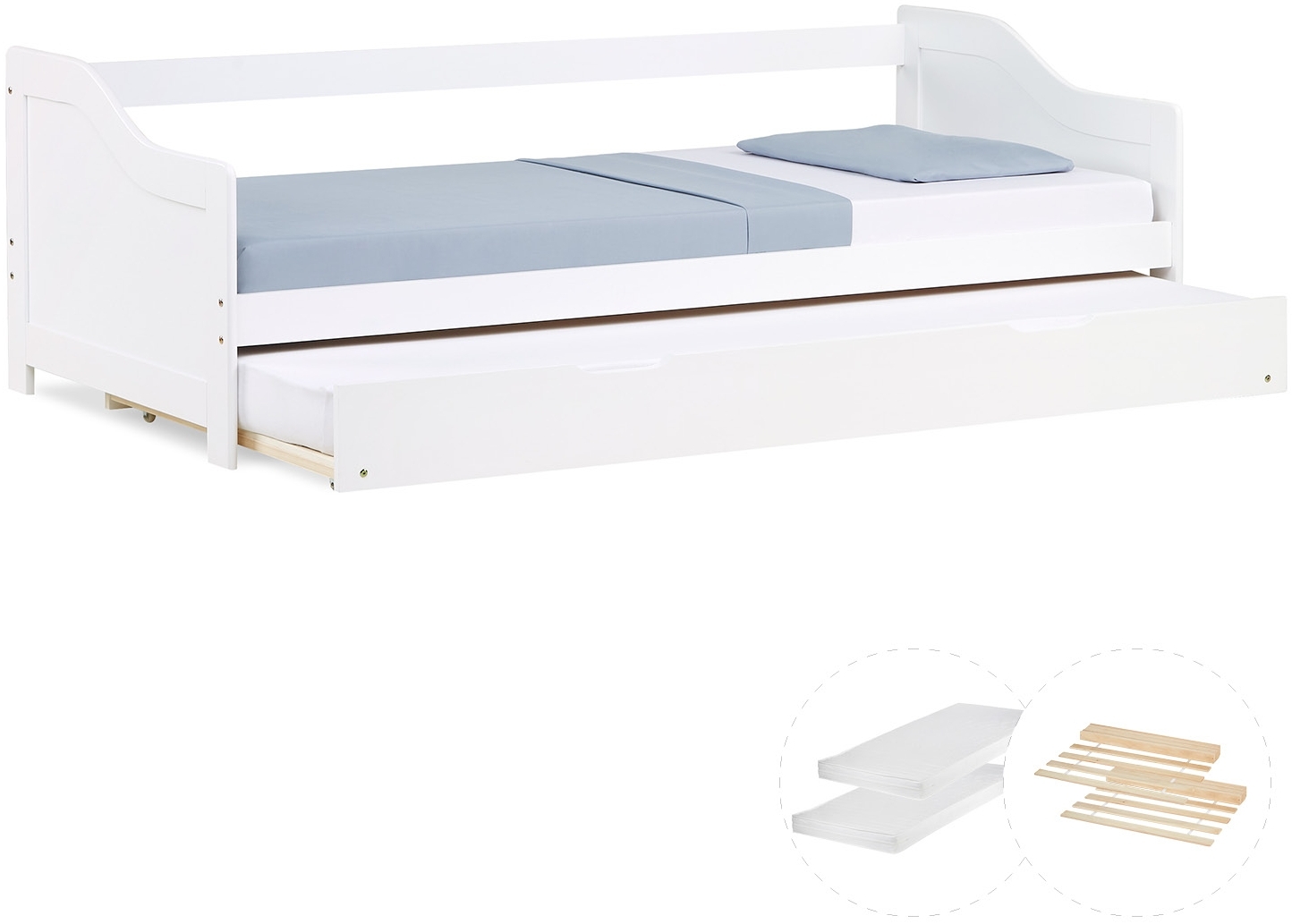 Dieses elegante Holzbett in Weiß ist die ideale Lösung für Kinder- und Jugendzimmer sowie Gästezimmer. Mit einer Liegefläche von 90x200 cm und einem cleveren Ausziehmechanismus bietet es eine praktische 2-in-1-Schlaflösung. Die robuste Konstruktion aus massivem Kiefernholz sorgt für Langlebigkeit und Sicherheit. Im Lieferumfang sind zwei Rollmatratzen und stabile Lattenroste enthalten, sodass das Bett sofort einsatzbereit ist. **Highlights** - Ausziehfunktion für zusätzliche Schlafgelegenheit - Robuste Verarbeitung aus massivem Kiefernholz - Inklusive zwei Rollmatratzen, Härtegrad 2 - Pflegeleichte und stabile Konstruktion - Platzsparendes Design für kleine Räume **Produkteigenschaften** - Maße (BxHxT): 97,5 x 66 x 206 cm - Liegefläche: 90x200 cm - Bettkantenhöhe: 31 cm - Höhe Front Bettauszug: 19 cm - Höhe Seitenteil: 66 cm (hinten) | 53 cm (vorn) - Einlegetiefe Matratze: 3,5 cm - Materialstärke: 20 mm - Maße je Matratze (BxHxT): 90 x 11 x 200 cm - Material Bezug Matratze: 100 % Polyester - Füllung Matratze: PU - Komfortschaumstoff - Maximale Belastung: 120 kg je Liegefläche **Lieferumfang** - Ausziehbett mit Matratzen - Aufbauanleitung - Montagezubehör - Bettwäsche und Dekoration sind nicht im Lieferumfang enthalten - Das Bett wird zerlegt geliefert und muss montiert werden