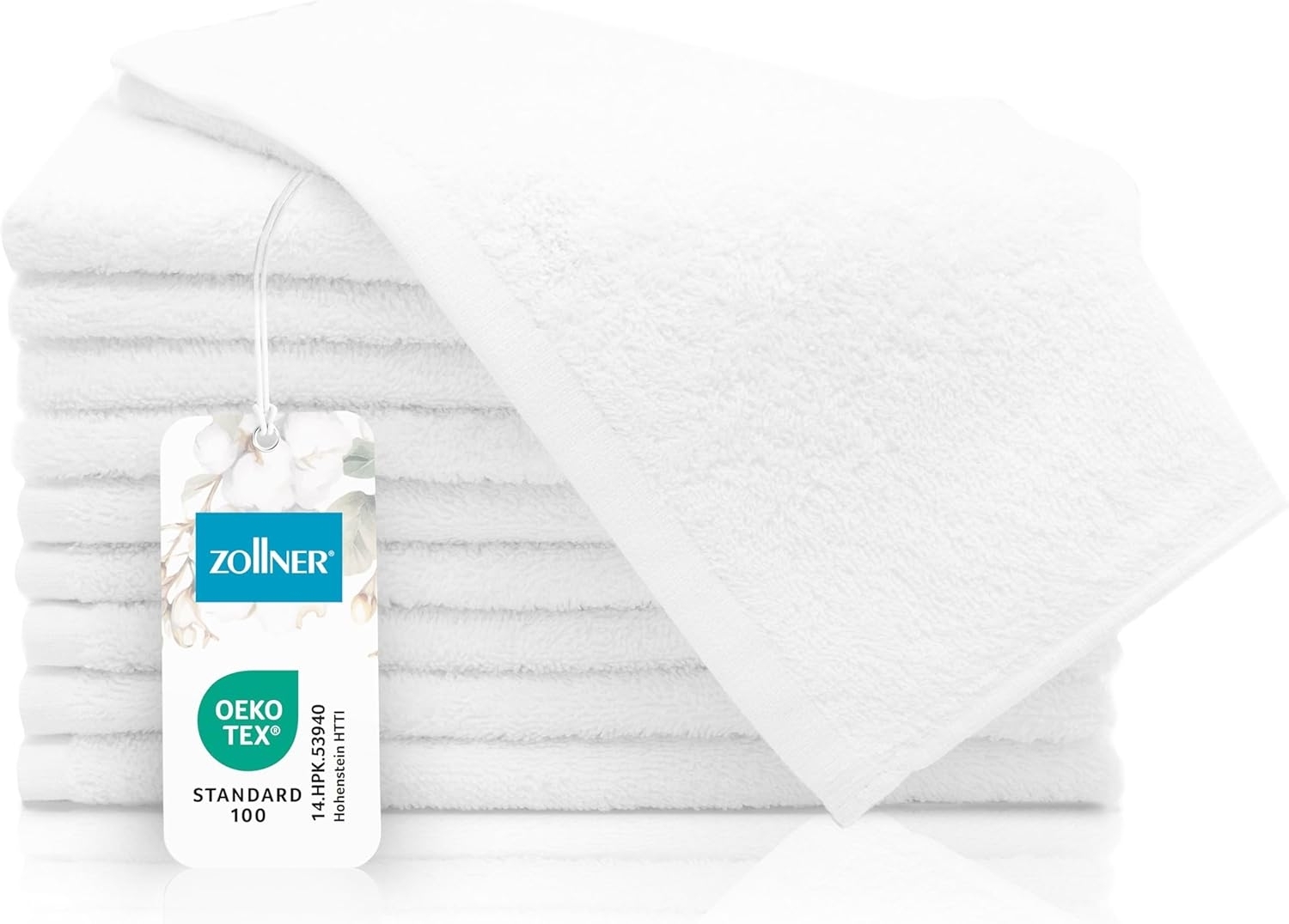 ZOLLNER Gästehandtücher im praktischen 10er Set sind die perfekte Ergänzung für Ihr modernes Badezimmer. Mit den Maßen 30 x 50 cm und einem Materialgewicht von ca. 450 g/qm bieten diese Tücher aus 100% Baumwolle hervorragende Saugfähigkeit und ein angenehmes Hautgefühl. Sie sind pflegeleicht, waschbar bis 95 °C und trocknergeeignet. Die Tücher sind mit einem praktischen Aufhänger versehen und überzeugen durch ihre Formbeständigkeit. **Highlights** - 10er Set für spontane Besuche - Hochwertiges Material aus 100% Baumwolle - Waschbar bis 95 °C und trocknergeeignet - Praktischer Aufhänger für einfache Handhabung - STANDARD 100 by OEKO-TEX (R) zertifiziert, Prüfnummer 14.HPK.53940 **Produkteigenschaften** - Maße: 30 x 50 cm - Materialgewicht: ca. 450 g/qm - Saugfähiges Walkfrottier - Formbeständig, auch nach mehreren Waschgängen - Stückgefärbt bis 60 °C waschbar (farbig), bis 95 °C (weiß) **Lieferumfang** - 10 x Gästehandtücher - Keine weiteren Produkte im Lieferumfang enthalten