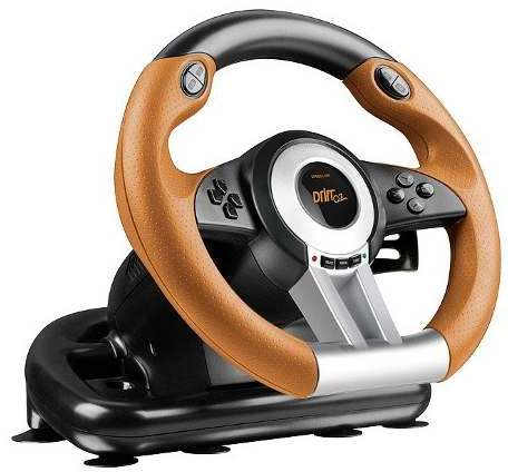 Das Speedlink DRIFT O.Z. Racing Wheel ist ein preiswertes Lenkrad mit Pedalen für Rennspiele. Es ist sehr genau und hat eine gute Zugraft der Gummi Bänder. Die Tasten sind im Spiel belegbar und es gibt verschiedene Modi, um ältere Rennspiele damit spielen zu können. Es hat jedoch einige Nachteile, wie knarzende Pedale, ein leichtes Lenkradspiel und nur Saugnäpfe zur Befestigung am Tisch.