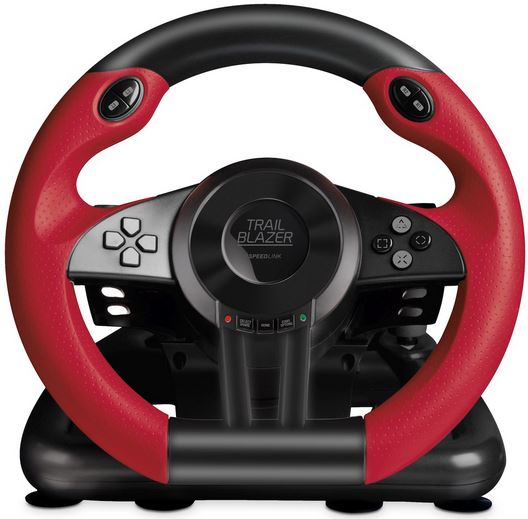 "Mit dem TRAILBLAZER bietet Speedlink einen einfachen Einstieg in das simulierte Fahrerlebnis. Das Lenkrad hat ein gutes Gefühl dank der gummierten Handauflage und bietet dank den 7 Saugnäpfen einen soliden Halt auf dem Tisch. Wem die Saugnäpfe zu schwach erscheinen, bietet Speedlink mit der Tischhalterung Abhilfe um auch im rasanten Geschehen nicht versehentlich das Lenkrad mitzureißen. ..."