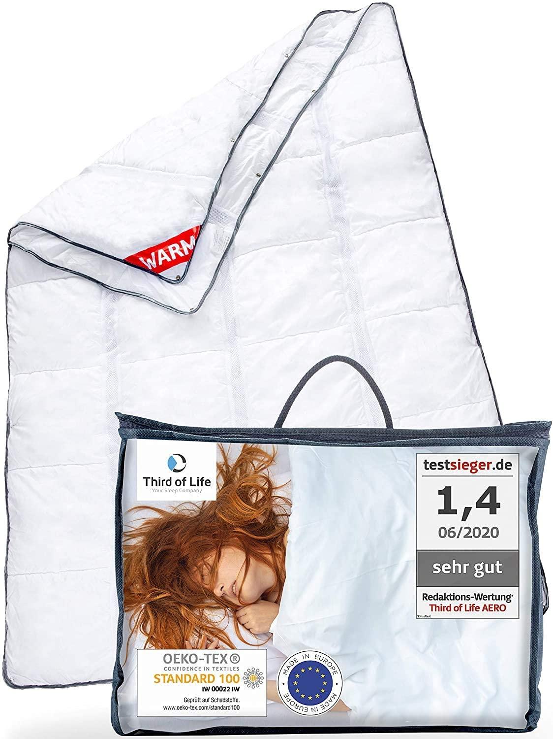 "Die Third of Life AERO überzeugt auf ganzer Linie. Die Schlafeigenschaften sind wirklich hervorragend und die Decke überzeugt durch einen ausgezeichneten Klimaausgleich. An der Verarbeitungsqualität gibt es ebenfalls nichts zu beanstanden. Ein weiterer Vorteil ist das flexible Konzept. Ob einzeln, nur Winter- und Sommerdecke oder alle drei Lagen auf einmal. Der Nutzer kann sich die Decke nach seinen Wünschen zusammenstellen."