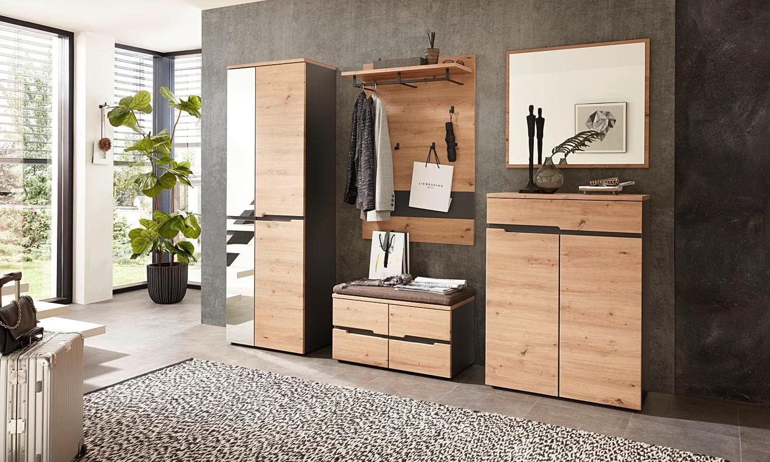 moebel-dich-auf Garderoben-Set MELBOURNE (Komplettgarderobe, Garderobenschrank + Paneel + Bank + Spiegel + Schuhkommode), in Artisan Eiche MDF, Absetzung graphit