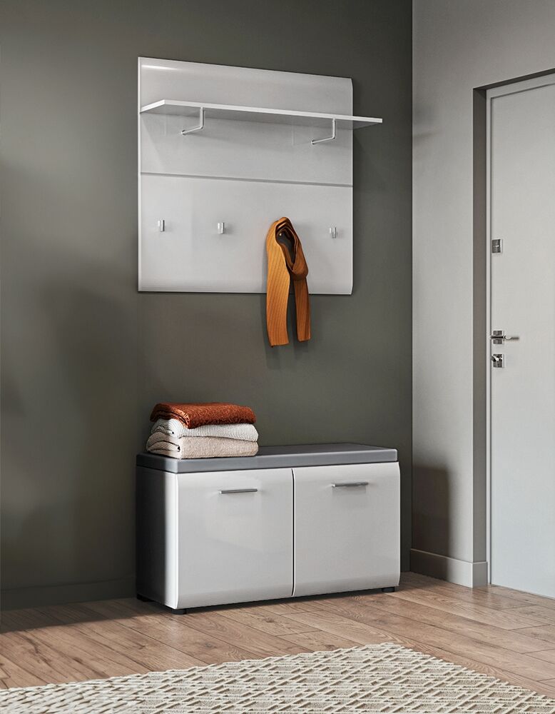 Moderne Eleganz trifft Funktionalität mit dem Garderoben-Set MALABO-129 in Hochglanz weiß. Dieses 2-teilige Set besteht aus einer Garderobenbank und einem Garderobenpaneel, die beide aus alpinweißer, laminierter Spanplatte gefertigt sind. Die edlen Hochglanz-Fronten aus MDF und die minimalistischen Kunststoffgriffe verleihen Ihrem Eingangsbereich einen stilvollen Akzent. Mit ausreichend Platz für Schuhe und praktischem Stauraum ist dieses Set die ideale Lösung für eine moderne Einrichtung. **Highlights** - Edle Hochglanz-Fronten aus MDF für einen modernen Look - Platz für 8 Paar Schuhe in der Garderobenbank - Inklusive Sitzkissen für zusätzlichen Komfort - Hochwertige Metallbeschläge für Stabilität und Langlebigkeit - Zeitloses Design, das sich in jede Einrichtung einfügt **Produkteigenschaften** - Korpus: Qualitätsspanplatte mit Melaminharzbeschichtung, alpinweiß - Front: MDF, weiß Hochglanz - Maße Garderobenbank (B/H/T): ca. 96 x 56,3 x 39 cm - Maße Garderobenpaneel (B/H/T): ca. 96 x 90 x 20 cm - 2 Einlegeböden in der Garderobenbank - 1 Hutablage, 2 Garderobenstangen, 4 Garderobenhaken im Garderobenpaneel - Kissenbezug: 100 % Polypropylen, grau **Lieferumfang** - 1 Garderobenbank mit 2 Türen, 2 Einlegeböden, 1 Sitzkissen - 1 Garderobenpaneel mit 1 Hutablage, 2 Garderobenstangen, 4 Garderobenhaken - Lieferung zerlegt zur Selbstmontage, ohne Dekoration und Zubehör