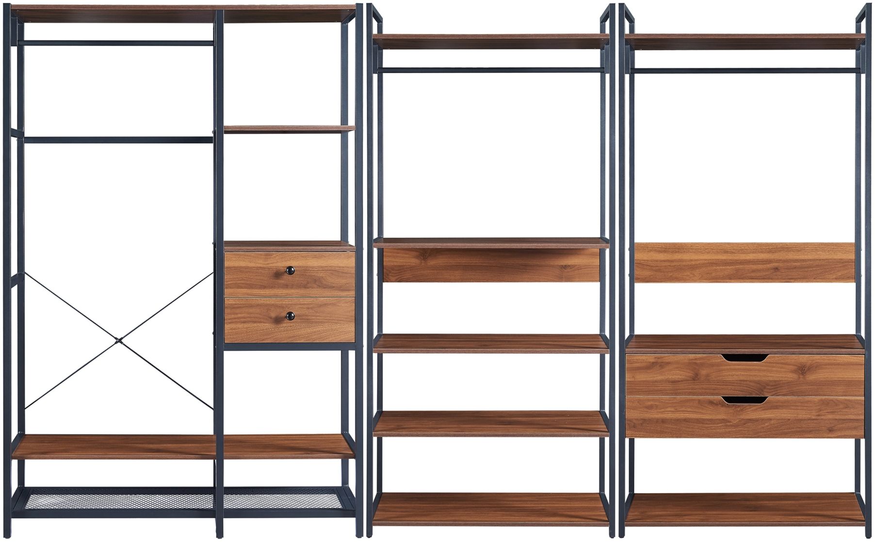 | Beschreibung | Dieses praktische Garderobenständer-Set von en.casa besteht aus drei hochwertigen Ständern, die für mehr Ordnung und Stauraum in Ihrem Zuhause sorgen. Jeder Ständer bietet eine Kleiderstange, Schubladen und Ablageflächen, die sich ideal für Jacken, Schuhe und Accessoires eignen. Das robuste Metallgestell gewährleistet einen stabilen Stand, während die ansprechende Walnuss-Oberfläche für eine stilvolle Optik sorgt. **Highlights** - Drei Garderobenständer mit je einer Kleiderstange - Vier Schubladen zum Verstauen von Handschuhen, Schmuck und weiteren Accessoires - Viele Ablageflächen für Schuhe, Hüte, Taschen und mehr - Robustes Gestell für einen stabilen Stand - Schneller und einfacher Aufbau **Produkteigenschaften** - Maße (Garderobenständer 1): Gesamt (HxBxT): 180 x 120 x 40 cm - Maße (Garderobenständer 1): Schubladen (HxB): je 15 x 44 cm - Maße (Garderobenständer 1): Offene Ablagefächer (HxB): je 39 x 44 cm - Maße (Garderobenständer 1): Länge der Garderobenstange: 68,5 cm - Maße (Garderobenständer 1): Abstand zwischen der Ablagefläche zur unteren Schublade: 36 cm - Maße (Garderobenständer 1): Abstand zwischen der unteren Gitterablage und der Ablagefläche: 17,5 cm - Maße (Garderobenständer 1): Fußhöhe: 5,5 cm - Maße (Garderobenständer 2): Gesamt (HxBxT): 180 x 84 x 40 cm - Maße (Garderobenständer 2): Länge der Garderobenstange: 80 cm - Maße (Garderobenständer 2): Höhe des Hängebereichs: 69 cm - Maße (Garderobenständer 3): Gesamt (HxBxT): 180 x 84 x 40 cm - Maße (Garderobenständer 3): Schubladen (HxB): je 14 x 80 cm - Maße (Garderobenständer 3): Länge der Garderobenstange: 80 cm - Maße (Garderobenständer 3): Höhe des Hängebereichs: 105 cm - Maße (Garderobenständer 3): Abstand zwischen der unteren Schublade und der unteren Ablage: 28 cm - Material: Rahmen, Garderobenstangen und Gitterablage: Metall - Material: Ablagen und Schubladen: MDF - Farbe: Rahmen, Garderobenstangen und Gitterablage: Schwarz - Farbe: Ablagen und Schubladen: Walnuss **Lieferumfang** - 3 x Garderobenständer |