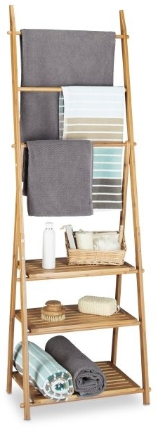 Der Handtuchhalter aus Bambus ist die ideale Lösung, um Ihre Handtücher, Badetücher oder Badesachen zum Trocknen aufzuhängen. Mit drei Handtuchstangen, die jeweils ca. 43,5 cm Platz bieten, und drei zusätzlichen Ablagen für Kleidungsstücke oder frische Handtücher, vereint er Funktionalität und elegantes Design. Der freistehende und faltbare Handtuchständer lässt sich platzsparend verstauen und bringt durch die natürliche Holz-Optik frische Eleganz in Ihr Bad. **Highlights** - Freistehend: Handtuchhalter mit 3 Handtuchstangen - Ihre Textilien trocknen schneller und entwickeln keine unangenehmen, stickigen Gerüche - Stauraum: 3 Ablagen bieten Platz für Badetücher, Kleidungsstücke, Schuhe, Toilettenpapier, frische Handtücher uvm. - Natürlich schön: Robuster Bambus mit feiner Maserung - Ideal für Räume mit hoher Luftfeuchtigkeit - Faltbar: Klappen Sie den Handtuchständer in Sekundenschnelle zusammen und verstauen Sie ihn platzsparend - Schneller Aufbau: Der Handtuchhalter kommt in Einzelteilen zu Ihnen nach Hause – Schnell und leicht aufzubauen **Produkteigenschaften** - Maße H x B x T: ca. 152 x 53 x 31 cm - Zusammengeklappt H x B x T: ca. 156 x 53 x 11 cm - 3 Handtuchstangen: ca. 43,5 cm breit - Gewicht: ca. 3,1 kg - Abstand zum Boden: ca. 4,8 cm - Untere Ablage H x B x T: ca. 27 x 43,5 x 29,5 cm - Mittlere Ablage H x B x T: ca. 22 x 43,5 x 24,5 cm - Obere Ablage B x T: ca. 43,5x21 cm - Mit 4 Kleiderhaken (2 je Seite) für Waschlappen, kleine Handtücher uvm. - Feuchtigkeitsresistenter, robuster Bambus - Stabiler Stand ohne Bohren **Lieferumfang** - Handtuchhalter in Einzelteilen - Montagematerial - Dekoartikel sind nicht im Lieferumfang enthalten