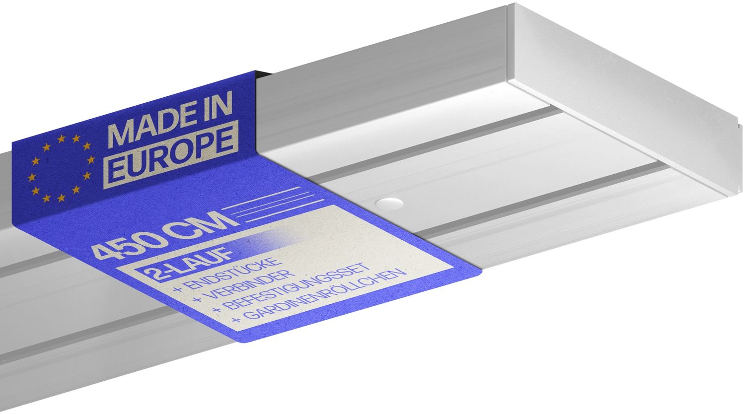 | Lieferumfang | 1x Vorhangschiene 90cm + 3x Vorhangschiene 120cm / 2-Lauf, Verbinder, Befestigungsset ( Schrauben, Dübel, Lochabdeckung ), Seitendeckel, Gardinenröllchen |