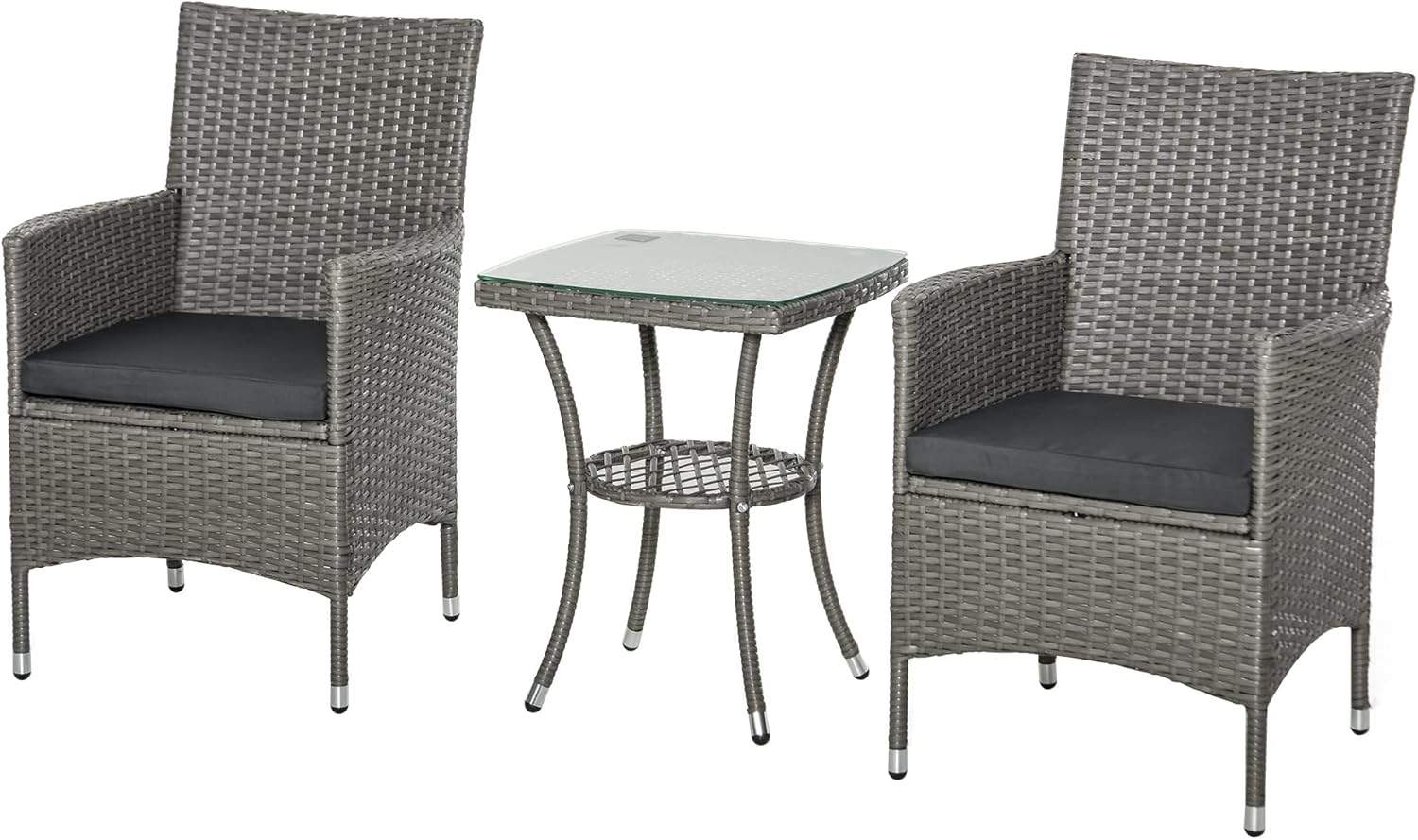 Die Outsunny Sitzgruppe ist ein stilvolles und komfortables 3-teiliges Gartenmöbel-Set, ideal für Terrasse und Balkon. Es besteht aus zwei Stühlen und einem Tisch mit gehärteter Glasplatte. Die wetterbeständigen Materialien und die bequemen, waschbaren Sitzkissen sorgen für eine angenehme Nutzung. Genießen Sie entspannte Stunden bei Kaffee oder Wein in dieser eleganten Sitzgruppe. **Highlights** - 3-teilige Sitzgruppe für drinnen und draußen - Robuster Metallrahmen mit rostfreien Aluminiumfüßen - Wetterbeständiger Kunststoff in Rattan-Optik - Bequeme, waschbare Sitzkissen - Tischplatte aus gehärtetem Glas **Produkteigenschaften** - Stuhlgröße: 60 x 58,5 x 89,5 cm - Tischgröße: 48 x 48 x 60 cm - Maximale Belastbarkeit: 160 kg (Stühle), 50 kg (Tisch) - Farbe: Grau - Material: Metall, PE-Rattan, Polyester, Schaumstoff, gehärtetes Glas **Lieferumfang** - 2 x Rattansitze - 2 x Sitzkissen - 1 x Couchtisch