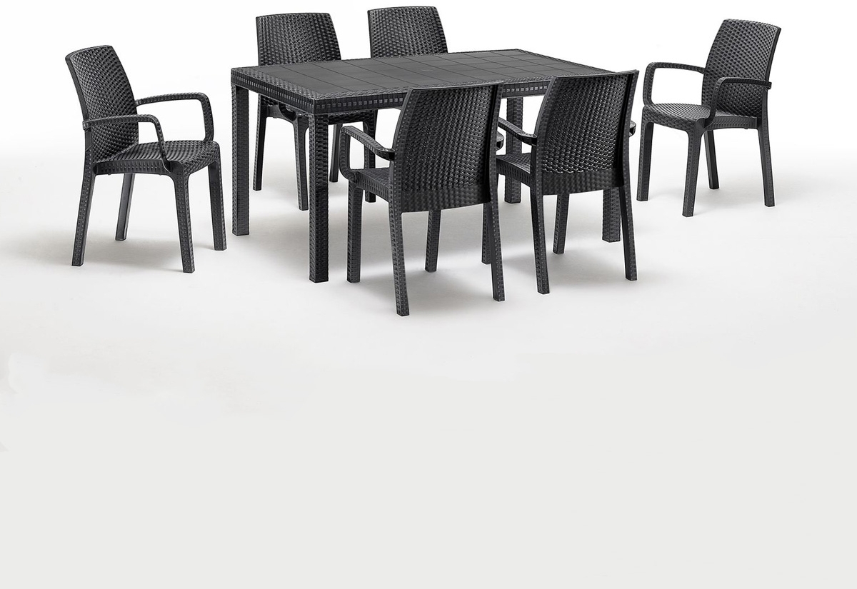 Das BICA Diningset 7 tlg. Verona bietet Ihnen eine stilvolle Essgruppe, bestehend aus einem großen Tisch Houston und 6 bequemen Stühlen. Die wetterfesten Gartenmöbel in Graphit sind ideal für Garten, Balkon oder gewerbliche Nutzung. Die Stühle aus wasserdichtem Polypropylen verfügen über komfortable Armlehnen, während der Tisch aus recycelbarem Harz mit Rattan-Einsatz gefertigt ist. **Highlights** - Wetterfest und leicht zu reinigen - Stühle aus robustem Polypropylen - Tisch aus recycelbarem Harz mit Rattan-Einsatz - Bequeme Armlehnen an den Stühlen - CATAS Zertifizierung für Sicherheit **Produkteigenschaften** - Maße Stuhl: L 57 cm x B 59 cm x H 86 cm - Maße Tisch: L 150 cm x B 90 cm x H 74 cm - Belastbarkeit Sessel: 100 kg (pro Sitzplatz) - Produktgewicht Stuhl: 4 kg - Produktgewicht Tisch: 16 kg - Material: Kunststoff, Polypropylen - Farbe: Anthrazit **Lieferumfang** - 6x Stühle, 1x großer Tisch
