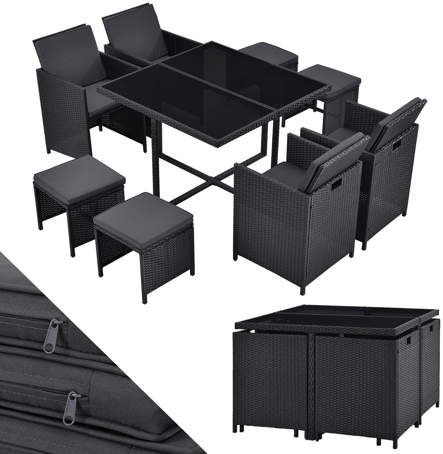 | Beschreibung | Die Juskys Polyrattan Sitzgruppe Baracoa L ist ein 9-teiliges Gartenmöbel-Set, das Platz für bis zu 8 Personen bietet. Mit einem hohen Tisch (74 cm) und einer großzügigen Tischfläche von 109 x 109 cm ist es ideal für gesellige Abende. Die wetterfeste Polyrattan-Konstruktion und das stabile Stahlgestell garantieren Langlebigkeit. Die abnehmbaren und waschbaren Sitzkissen sorgen für zusätzlichen Komfort. Das platzsparende Design ermöglicht eine einfache Aufbewahrung als Würfel. **Highlights** - 9-teiliges Set für bis zu 8 Personen - Platzsparende Aufbewahrung als Würfel - Wetterfestes Polyrattan und stabiles Stahlgestell - Inklusive abnehmbarer und waschbarer Sitzkissen - Hoher Esstisch mit Glasplatte **Produkteigenschaften** - Material: Polyrattan, Stahl, Glas - Farbe: Schwarz (Polyrattan), Dunkelgrau (Stoff), Schwarz (Glas) - Maße Tischfläche: 109 x 109 cm - Tischhöhe: 74 cm - Sitzfläche Hocker: 41 x 41 cm - Sitzhöhe Hocker (mit Kissen): 40 cm - Sitzhöhe Hocker (ohne Kissen): 36 cm - Sitzfläche Stuhl: 40 x 47 cm - Sitzhöhe Stuhl (mit Kissen): 48 cm - Sitzhöhe Stuhl (ohne Kissen): 44 cm - Rückenlehne Stuhl: 40 cm - Dicke Sitzkissen: 4 cm **Lieferumfang** - 1 x Tisch - 4 x Stühle - 4 x Hocker - 8 x Sitzkissen - 4 x Rückenkissen - 1 x Anleitung |