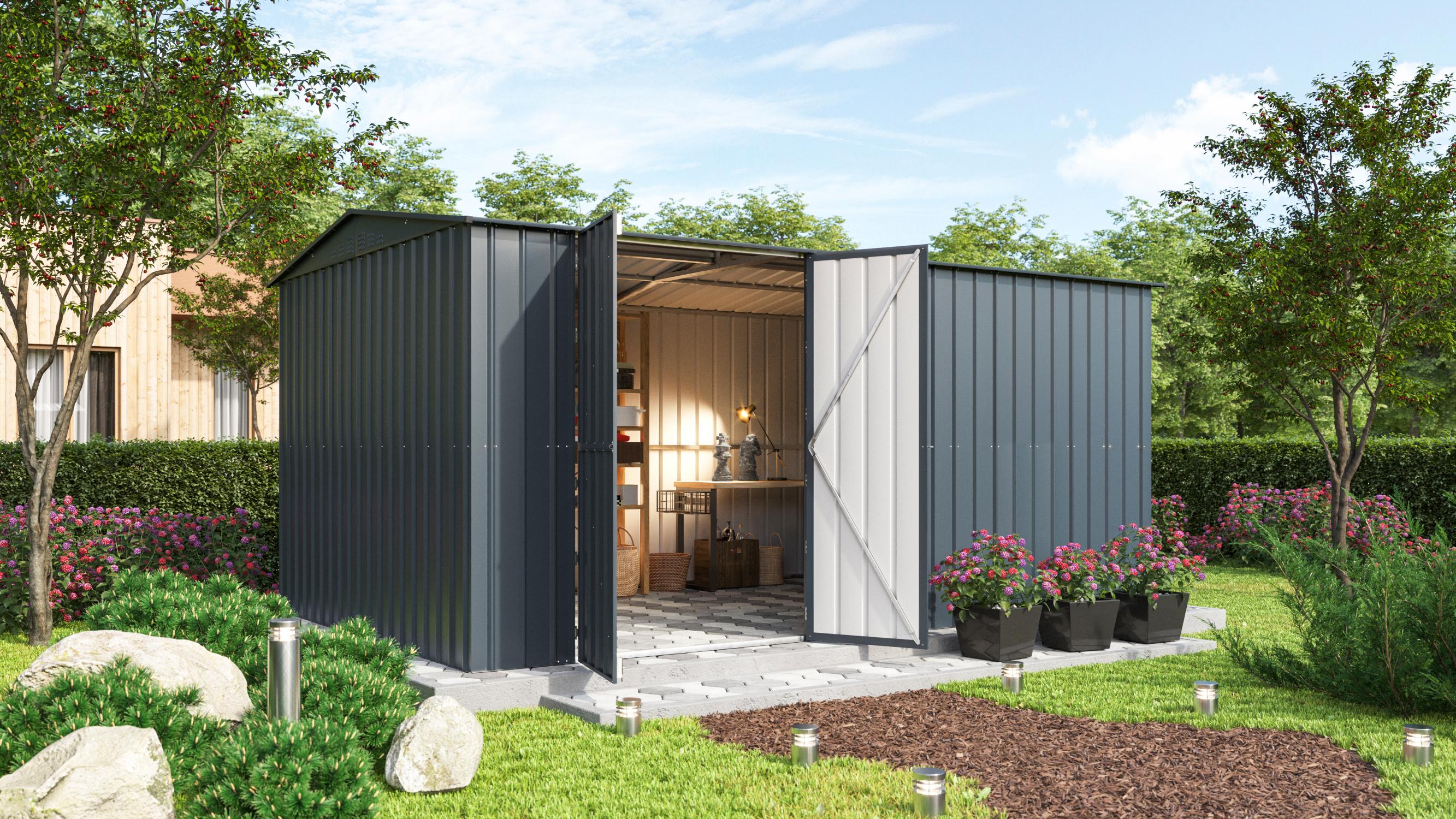 Das Globel Industries Gerätehaus "Worker 1510" in anthrazit ist ein hochwertiges Gerätehaus aus feuerverzinktem Stahlblech. Mit einer Grundfläche von über 13 Quadratmetern und einer Höhe von 2,25 Metern bietet es ausreichend Platz für Gerätschaften und Bewegungsfreiheit. Die großen Doppelschwingtüren ermöglichen einen bequemen Zugang. Das Gerätehaus wird als Bausatz ohne Boden geliefert und überzeugt durch seine stabile Konstruktion sowie die gestanzten Lüftungsschlitze für eine optimale Belüftung. **Highlights** - Premium-Gerätehaus aus stabilem Stahlblech - Große Doppelschwingtüren für bequemen Zugang - Viel Platz für Gerätschaften und Bewegungsfreiheit - Hochwertige Verarbeitung und erhöhte Stabilität - Dauerbelüftung durch gestanzte Lüftungsschlitze **Produkteigenschaften** - Abmessungen: 2,25 m Höhe - Grundfläche: über 13 Quadratmeter - Material: feuerverzinktes Stahlblech - Farbe: anthrazit - Innenliegende Kastenprofile für zusätzliche Stabilität - Stabile Konstruktion mit speziellem Paneeldesign **Lieferumfang** - Gerätehaus "Worker 1510" in anthrazit (Bausatz ohne Boden)