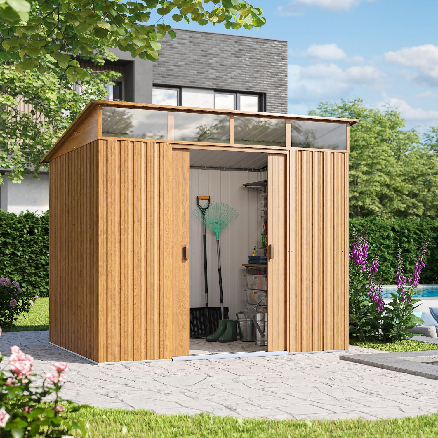 Das Pergart Gerätehaus "Lübeck 86" in Holzoptik mit 4,05 m² Fläche sorgt für Ordnung im Garten. Die Seitenhöhe von 1,70 bis 2,03 m bietet eine angenehme Stehhöhe. Hergestellt aus galvanisiertem 0,3 mm Stahlblech mit Polyesterlackierung, ist das Gerätehaus robust und rostbeständig. Die innenlaufenden Schiebetüren sind mit einem Vorhängeschloss verschließbar und die Lichtpaneele in der Front sorgen für Tageslicht im Inneren. Ein Lufteinlass im Dachbereich gewährleistet optimale Belüftung. **Highlights** - Angenehme Stehhöhe - Lichtpaneele in der Front für Tageslicht - Robuste Konstruktion aus verzinktem Stahlblech - Innenlaufende Schiebetür mit Vorhängeschloss - Lufteinlass im Dachbereich für Belüftung **Produkteigenschaften** - Material: galvanisiertes 0,3 mm Stahlblech mit Polyesterlackierung - Seitenhöhe: 1,70 bis 2,03 m - Schiebetür mit Kunststoffgleitern - Lieferung zerlegt, ohne Boden - Farbe: Holzoptik