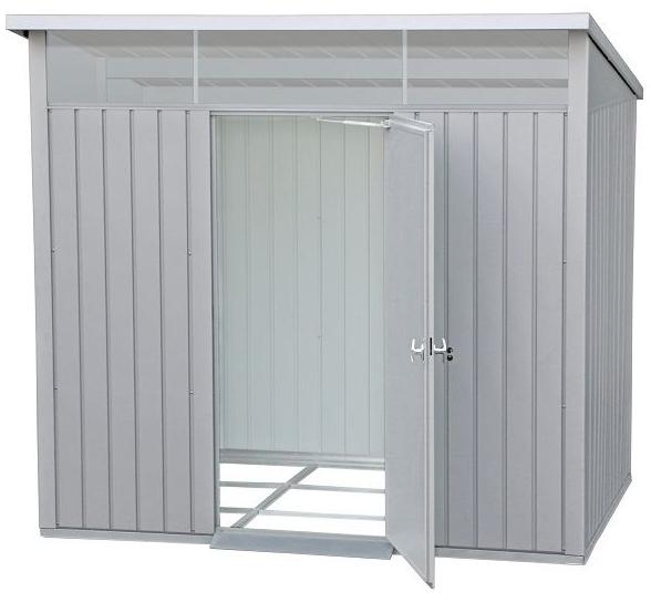 Das Duramax Metallgerätehaus Palladium bietet Ihnen großzügigen Stauraum und ein ansprechendes Design. Die silber-graue Pulverbeschichtung aus feuerverzinktem Stahlblech sorgt für Langlebigkeit. Mit einer abschließbaren Tür, einer praktischen Gasdruckfeder, einem großen Lichtband und einer stabilen Metall-Unterkonstruktion ist dieses Gerätehaus sowohl funktional als auch stabil. Die Maße betragen 244,9 x 181,9 x 231 cm. **Highlights** - Abschließbare Tür für Sicherheit - Gasdruckfeder für leichtes Öffnen und Schließen - Großes Lichtband für ausreichende Beleuchtung - Stabile Metall-Unterkonstruktion - Einfache Montage in wenigen Stunden **Produkteigenschaften** - Wandstärke: ca. 0,5 mm - Dachneigung: ca. 10° - Außenmaße: 249,2 x 209,2 x 231,3 cm - Innenmaße: 240,7 x 177,7 x 188,3 cm **Lieferumfang** - Metallgerätehaus Palladium - Bodenrahmen - Metall-Unterkonstruktion - Schloss mit Schlüssel - Montagematerial