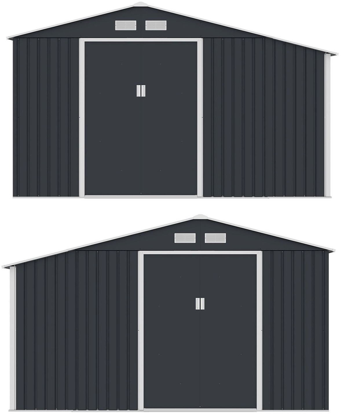| Name | Juskys Metall Gerätehaus XL mit Holzunterstand, Schiebetür, Lüftungsgitter, Fundament - Geräteschuppen Gartenhaus Metallgerätehaus Holzregal - Grau |