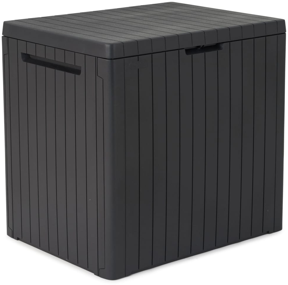 Die Keter Garten Aufbewahrungsbox City bietet mit ihrem attraktiven Design in Holzoptik eine stilvolle und praktische Lösung für die Aufbewahrung von Gartenmöbelkissen, Gartengeräten oder Spielzeug. Hergestellt aus strapazierfähigem, witterungsbeständigem Kunststoff, ist sie pflegeleicht und ideal für kleinere Außenbereiche. Mit einer maximalen Tragfähigkeit von 120 kg kann sie auch als zusätzlicher Sitz oder Beistelltisch genutzt werden. **Highlights** - Attraktive Holzoptik - Witterungsbeständig und pflegeleicht - Maximale Tragkraft von 120 kg - Multifunktional einsetzbar - Integrierte Griffe für einfache Handhabung **Produkteigenschaften** - Farbe: Anthrazit - Material: Kunststoff PP - Abmessungen: 57,8 x 44 x 55 cm (B x T x H) - Fassungsvermögen: ca. 113 Liter - Maße innen: 57,7 x 41,6 x 51,6 cm - Deckel bis 100 kg belastbar - Artikelnummer: V422810 - EAN/GTIN: 7290112631558