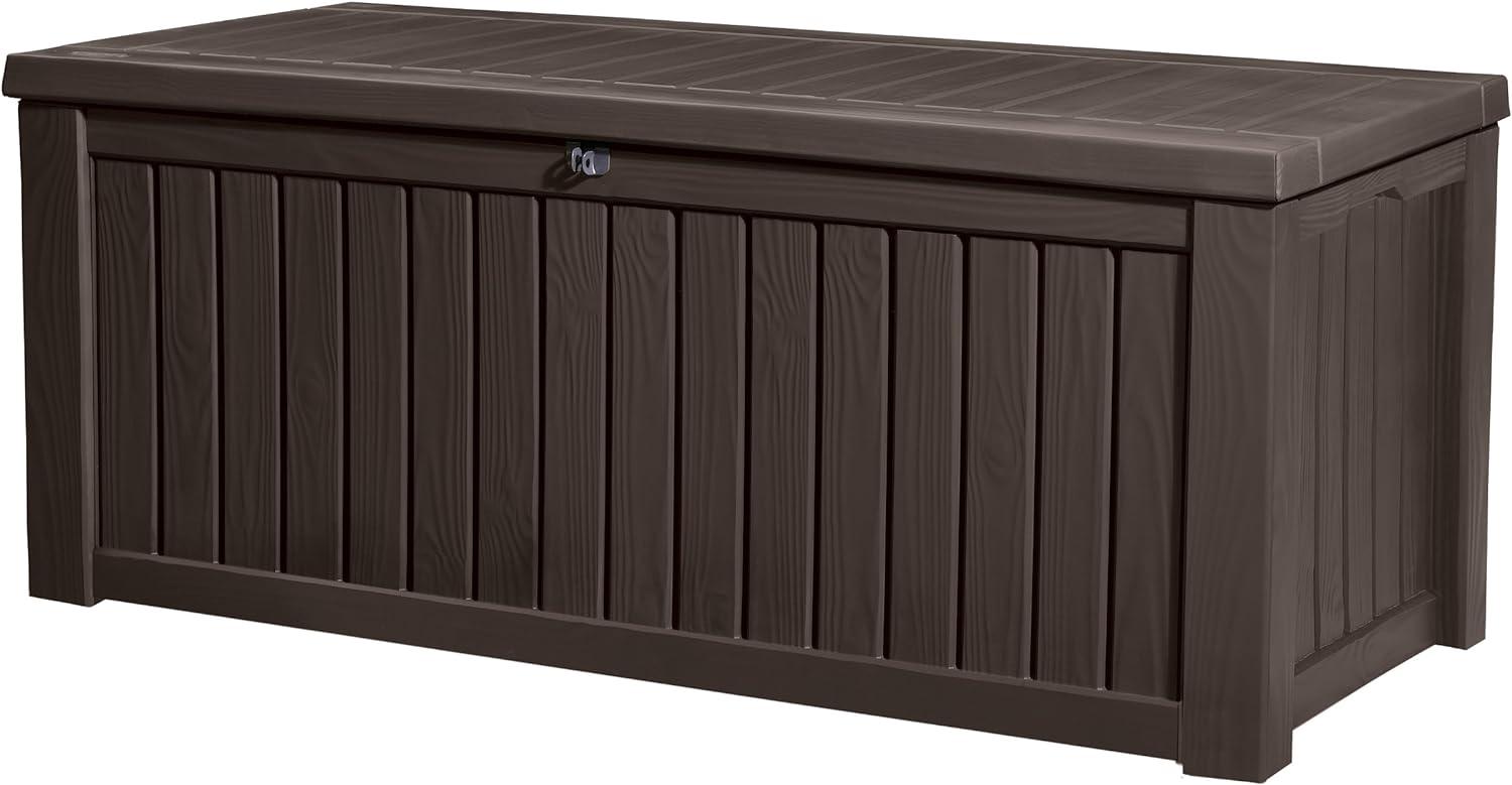 | Name | Keter Kissenbox Rockwood, braun, 570l Fassungsvermögen, Außenmaße: 155 x 72,4 x 64,4 cm, Auflagenbox wasserdicht, für Outdoor geeignet, Keterbox |