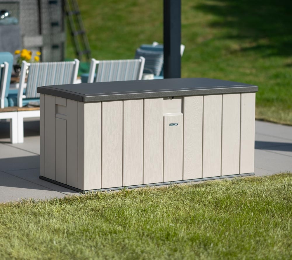 Die Lifetime Kunststoff Gartenbox bietet mit einem Stauraum von 570 Litern eine ideale Lösung für die Aufbewahrung von Kissen, Gartenutensilien und mehr. Hergestellt aus robustem Polyethylen-Kunststoff, überzeugt sie durch ihre doppelwandige, 26 mm starke Konstruktion und eine Belastbarkeit von bis zu 300 kg. Die Box ist wetterfest, pflegeleicht und lässt sich dank Gasdruckdämpfer komfortabel öffnen. Mit ihrem lichtgrauen Design fügt sie sich harmonisch in jeden Garten ein. **Highlights** - Unverwüstlich und wetterfest - 570 Liter Stauraum - Belastbar bis zu 300 kg - Gasdruckdämpfer für einfachen Zugang - 100 % UV-beständig **Produkteigenschaften** - Abmessungen: 72 x 151 x 70 cm - Material: Polyethylen-Kunststoff - Doppelwandige Konstruktion - Wartungsfrei und pflegeleicht - Vorhängeschloss-Vorrichtung