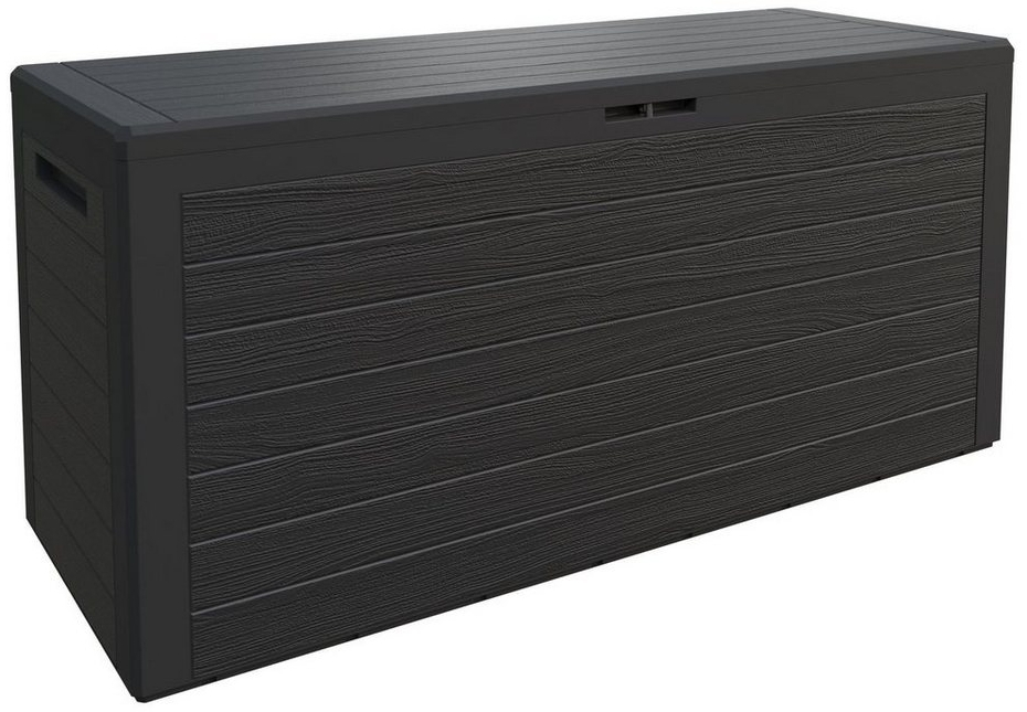 Die Deuba Woody Holzoptik Kissenbox bietet mit einem Fassungsvermögen von 300 Litern viel Stauraum für Ihre Sitzauflagen, Kissen und Spielzeuge. Der klappbare Deckel verfügt über eine integrierte Abschließvorrichtung für eine sichere Aufbewahrung. Die Box ist aus wetterfestem Kunststoff gefertigt und dank der seitlichen Griffmulden leicht zu transportieren. Das moderne und zeitlose Design passt perfekt auf Ihre Terrasse, in den Garten oder auf den Balkon. Die Montage erfolgt schnell und einfach ohne Werkzeug dank des praktischen Klick-Systems. **Highlights** - XXL Stauraum von 300 Litern - Witterungs- und UV-beständiges Material - Klappbarer Deckel mit Abschließvorrichtung - Seitliche Griffmulden für leichten Transport - Einfache Montage durch Klick-System **Produkteigenschaften** - Maße: 120 x 46 x 57 cm (L x B x H) - Innenmaße: 116 x 43 x 54 cm (L x B x H) - Material: Kunststoff (Polypropylen) - Farbe: Anthrazit **Lieferumfang** - 1x Auflagenbox Woody 300 L - Anthrazit