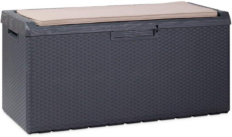| Name | Kissenbox Portonovo 350 l anthrazit Rattan/Holzoptik – wetterfeste Gartenbox mit Sitzfunktion Gasdruckfedern Rollen Schlossvorrichtung 350 Liter Stauraum für Auflagen Zubehör |