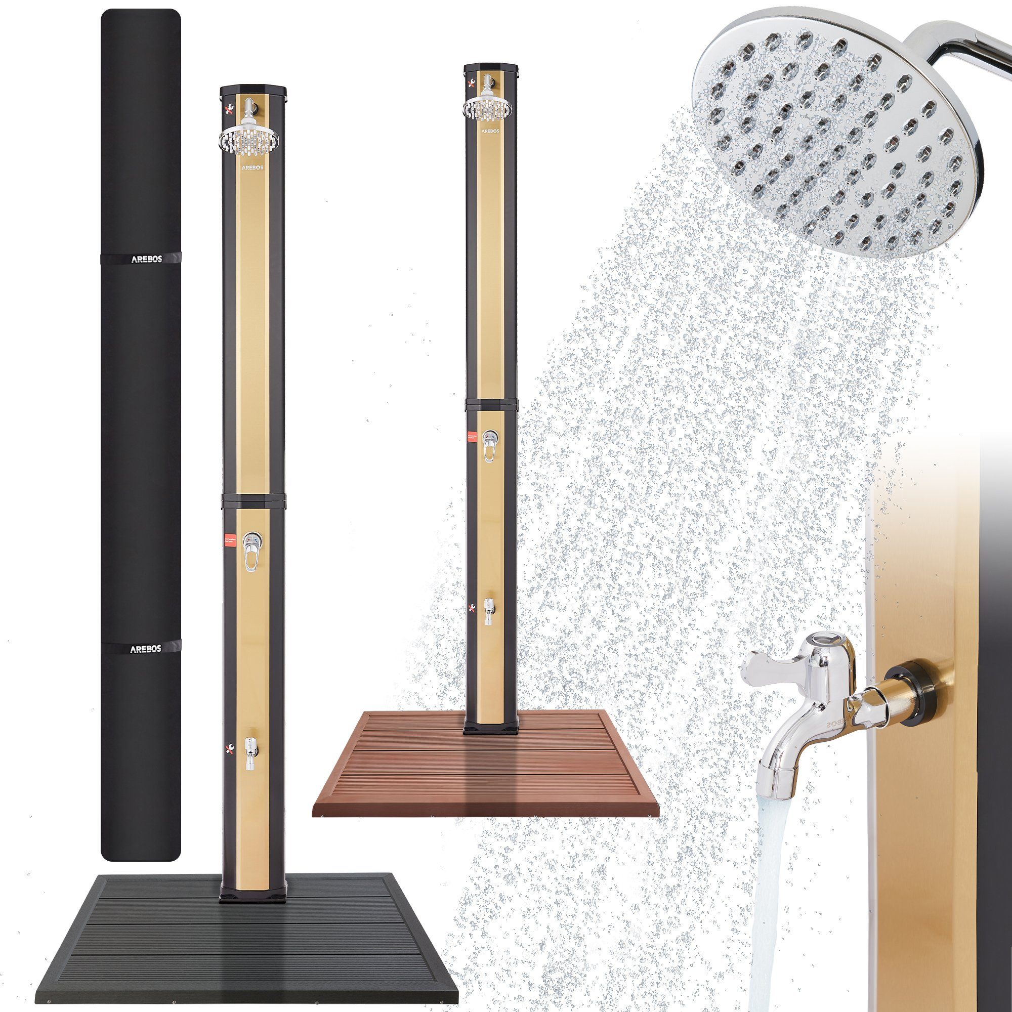Arebos Solardusche 35L mit Handbrause&Thermometer Schwarz/golden (Set, mit Bodenplatte) Energieeffiziente Gartendusche mit 35l Tankvolumen