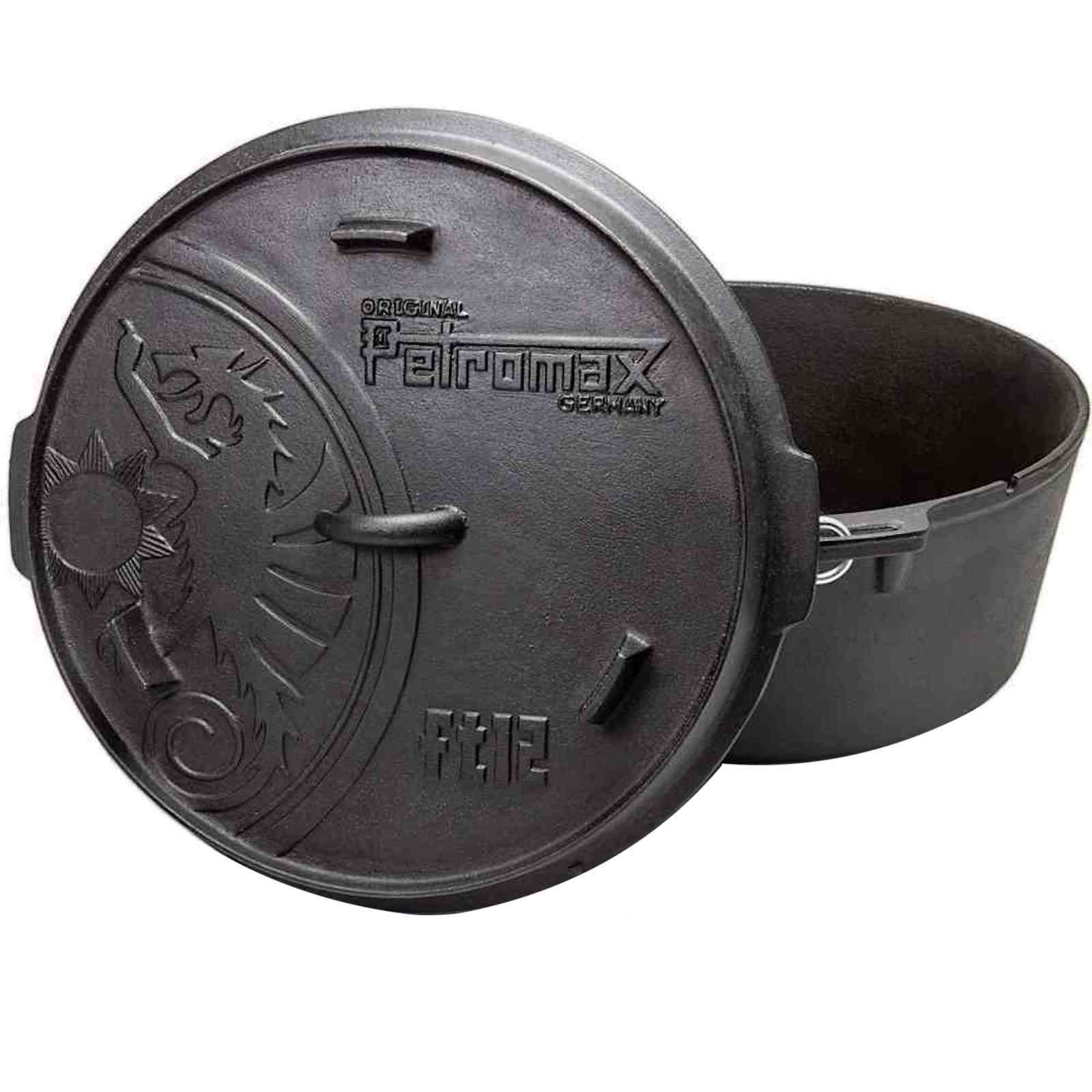 Der Petromax Feuertopf 12qt FT12-T ohne Füße ist ein schwerer und hochwertig verarbeiteter Dutch Oven, der sich gut für die Zubereitung großer Mahlzeiten eignet. Er bietet eine gleichmäßige Wärmeverteilung und hält die Speisen lange warm. Der Deckel kann auch als Pfanne verwendet werden, jedoch ist das Gewicht des Topfes eine Herausforderung, insbesondere wenn er voll ist.