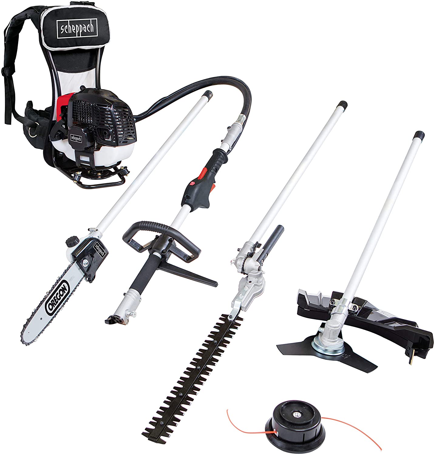 Scheppach 5904805903 Backpacker 4 in 1 = MotorsenseRasentrimmer, Heckenschere, Hochentaster | Benzin Multitool mit 2 Taktmotor und 51,7 cm³ auf Rucksack? | 1,3 kW (1,8 PS), 16,5 kg