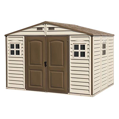 Das Duramax WoodSide 10 x 8 Kunststoffgerätehaus bietet eine einfache Lösung zur Aufbewahrung von Gartengeräten und anderen Utensilien im Garten. Mit drei festen Fenstern sorgt es für ausreichend Licht im Inneren, während das Metallfundamentset eine stabile Basis bildet. Die Wetterbeständigkeit des Materials schützt den Inhalt vor Regen und anderen Umwelteinflüssen.