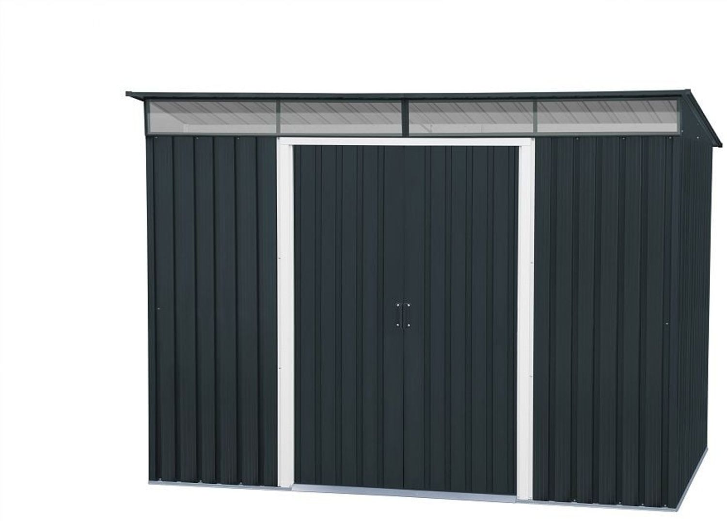 Das Duramax Metallgerätehaus Pent Roof Skylight bietet mit seinen großzügigen Abmessungen von 263,5 x 184,5 x 202 cm ausreichend Platz für Ihre Werkzeuge, Gartengeräte oder Gartenmöbel. Hergestellt aus pulverbeschichtetem, feuerverzinktem Stahlblech, ist es langlebig und wartungsfrei. Die großen Schiebetüren, die Belüftung und das Lichtband sorgen für eine praktische und helle Lagerlösung. **Highlights** - Große Schiebetüren für einfachen Zugang - Pultdach für zusätzlichen Stauraum - Belüftung für optimale Luftzirkulation - Lichtband an der Frontseite für natürliche Beleuchtung - Vielseitiger Einsatz auf Campingplätzen möglich **Produkteigenschaften** - Innenmaße: ca. B 247,6 x T 164 x H 166,3 cm - Grundfläche: ca. B 251,9 x T 171,8 cm - Wandstärke: ca. 0,33 mm - Innere Wandhöhe: ca. 180 cm - Gewicht: 71 kg **Lieferumfang** - Metallgerätehaus ohne Bodenplatte - Inkl. Türgriffe, abschließbar (Schloss nicht enthalten) - 2 große Schiebetüren (lichte Breite der Türöffnung: ca. 103 x 175 cm BxH) inkl. Türgriffe, abschließbar (Schloss nicht im Lieferumfang enthalten)