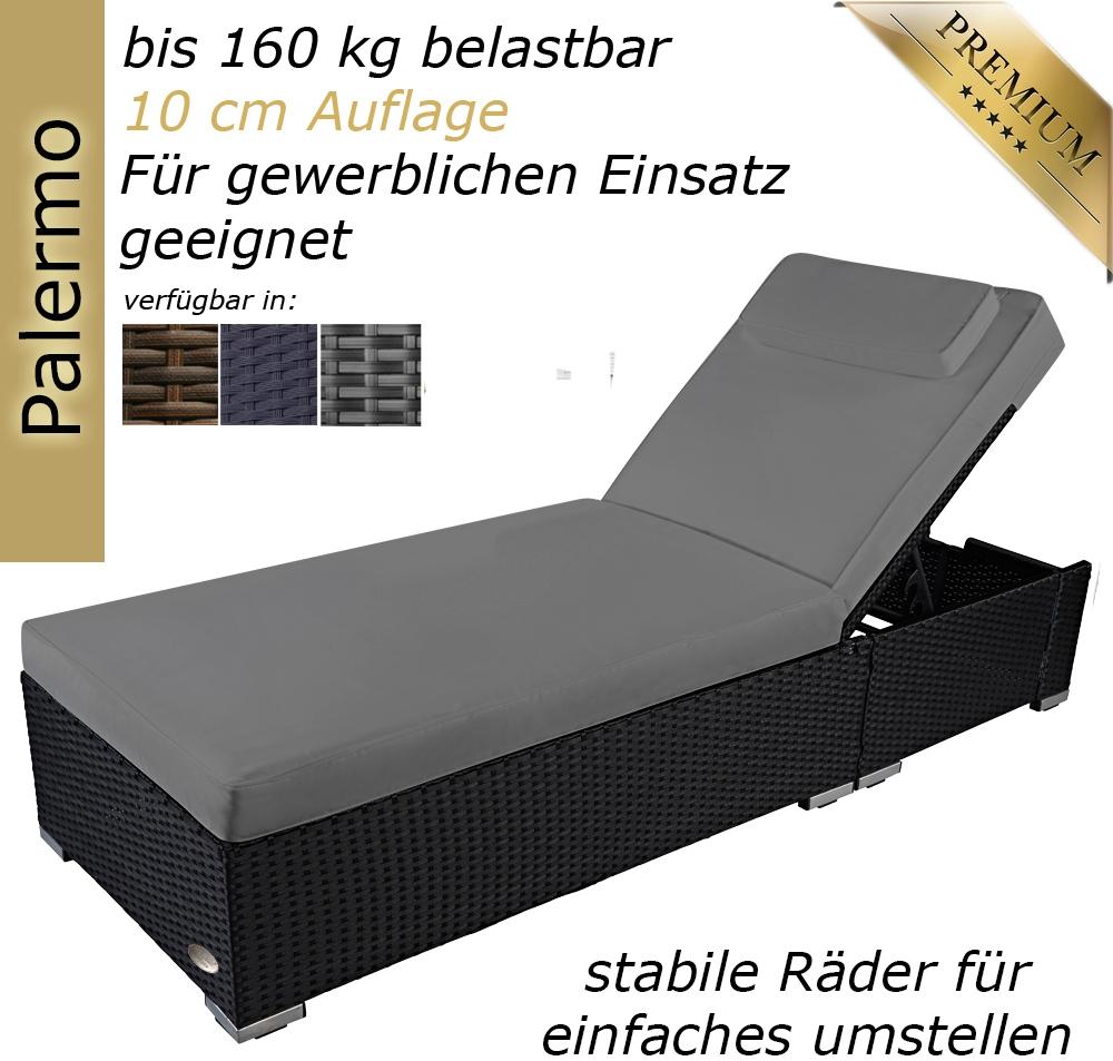 Die RS Trade Gartenliege Sonnenliege Palermo vereint Komfort und Funktionalität. Mit einer stabilen Konstruktion aus handgeflochtenem Poly-Rattan-Geflecht und einem rostfreien Aluminiumrahmen ist sie sowohl für den Innen- als auch Außenbereich geeignet. Die 5-fach verstellbare Rückenlehne und die hochwertige Auflage mit Kopfkissen sorgen für entspanntes Liegen. Dank der stabilen Räder lässt sich die Liege mühelos umstellen. **Highlights** * Sitzhöhe ca. 42 cm (inkl. 10 cm Auflage) * stabile Räder am Kopfende ermöglichen ein bequemes Umstellen * jede Liege besteht aus einem handgeflochtenen Poly-Rattan-Geflecht (1,2 mm stark) * das Poly-Rattan ist beständig gegen UV-Licht sowie Salz- und Chlorwasser * bis zu 160 kg belastbar, bestens für gewerbliche Nutzung geeignet **Produkteigenschaften** * Aluminium-Rahmen (rostfrei) und Edelstahlschrauben (rostfrei) * für den Innen- und Außenbereich (ganzjährig) geeignet * Rückenlehne 5 – fach verstellbar, inkl. Liegeposition (ganz flach) * hochwertige Auflage mit Kopfkissen (Bezüge bei 40° Grad waschbar) * kein Verrutschen der Auflage, die Husse wird an der Rückenlehne eingehängt * Aluminium Füße mit Kunststoffschutz (kein Verkratzen Ihres Bodens) * Länge 200 cm x Breite 70 cm x Höhe 32 cm **Lieferumfang** - 1 x Sonnenliege Palermo 1 x 10 cm dicke Auflage inkl. Kopfteil