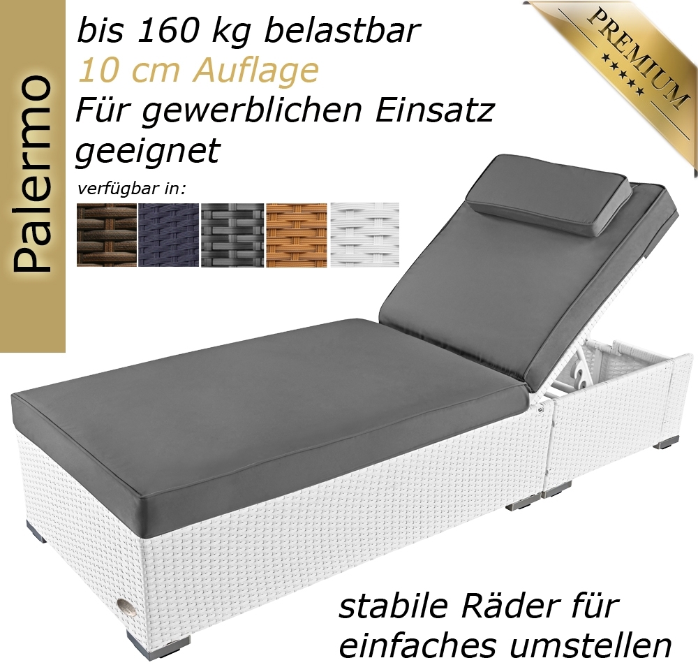 Die Sonnenliege Palermo mit Rollen bietet höchsten Komfort und Flexibilität für Ihren Innen- und Außenbereich. Gefertigt aus hochwertigem, handgeflochtenem Poly-Rattan (1,2 mm stark) in Weiß, ist sie UV-beständig sowie resistent gegen Salz- und Chlorwasser. Mit einer Liegefläche von 200 cm x 70 cm und einer stabilen Belastbarkeit von bis zu 160 kg ist sie ideal für gewerbliche Nutzung. Die 5-fach verstellbare Rückenlehne und die hochwertige Auflage mit Kopfkissen sorgen für entspanntes Liegen. **Highlights** * Sitzhöhe ca. 42 cm (inkl. 10 cm Auflage) * Stabile Räder am Kopfende ermöglichen ein bequemes Umstellen * Poly-Rattan ist beständig gegen UV-Licht sowie Salz- und Chlorwasser * Aluminium-Rahmen (rostfrei) und Edelstahlschrauben (rostfrei) * Für den Innen- und Außenbereich (ganzjährig) geeignet **Produkteigenschaften** * Länge 200 cm x Breite 70 cm x Höhe 32 cm * Rückenlehne 5-fach verstellbar, inkl. Liegeposition (ganz flach) * Hochwertige Auflage mit Kopfkissen (Bezüge bei 40° Grad waschbar) * Kein Verrutschen der Auflage, die Husse wird an der Rückenlehne eingehängt * Aluminium Füße mit Kunststoffschutz (kein Verkratzen Ihres Bodens) * Verpackungsabmessung: 132 x 74 x 36 cm * Bruttogewicht ca. 18 kg **Lieferumfang** - * 1 x Sonnenliege Palermo * 1 x 10 cm dicke Auflage inkl. Kopfteil