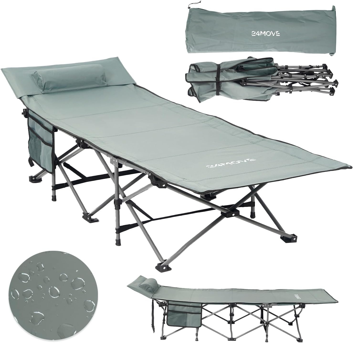| Name | 24Move Regal Feldbett, Gartenliege, Campingbett bis 150 kg, klappbar, zelten, grau, wasserabweisend, inkl. Seitentasche |