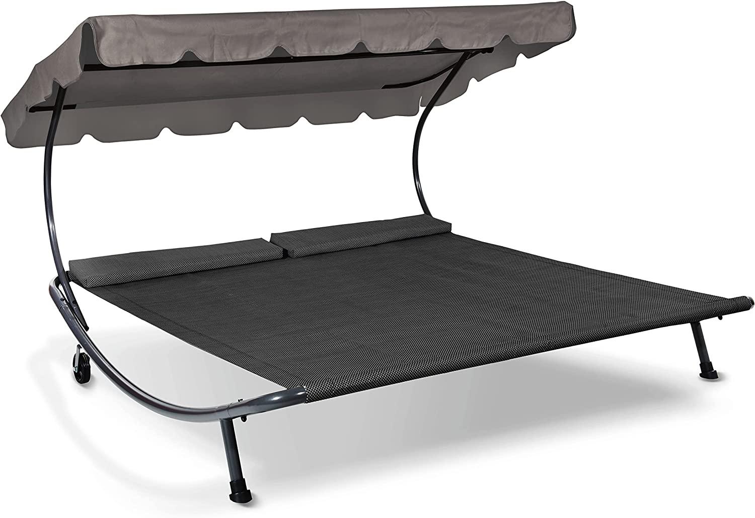 **Komfortable Doppelsonnenliege mit verstellbarem Sonnendach** Die Doppelsonnenliege von Leco ist bietet mindestens zwei Personen einen gemütlichen und schattigen Rückzugsort in Ihrem Garten. Der besondere Clou ist das integrierte, in der Neigung verstellbare Sonnendach das Sie vor Sonnenbrand schützt und kühlenden Schatten spendet. **Verstellbares Sonnendach und praktische Rollen** Die Sonnenblende der Doppelliege lässt sich je nach Sonnenstand ausrichten und spendet so Schatten genau dort, wo Sie ihn haben möchten. Das Dachtextil ist UV-beständig und bietet somit den perfekten Schutz an sonnigen Sommertagen. Zudem ist das Sonnendach wasserabweisend und bietet somit auch Schutz vor leichtem Nieselregen. Für eine bequeme Polsterung sorgen die mitgelieferten Kopfkissen. Diese lassen sich bei Bedarf abnehmen. Für ein einfach verstellen der Sonnenliege verfügt diese über zwei Rollen am Kopfende. So kann Sie einfach verschoben werden. **Beste Verarbeitung und durchdachte Materialien** Die Leco Doppelsonnenliege "DAS ORIGINAL" überzeugt neben Ihrer tollen Optik vor allem durch Ihre herausragende Qualität. Die verwendeten Materialen sorgen dafür, dass die Sonnenliege auch nach vielen Jahren noch Freude bereitet. Das Gestell der Doppelliege ist aus Stahlrohren gefertigt und dadurch besonders standfest. Dank der Pulverbeschichtung ist der Rahmen zudem vor Witterungseinflüssen geschützt. Die Liegefläche und der Sonnenblende sind aus widerstandfähigem Outdoor-Polyestergewebe gefertigt und dadurch widerstandsfähig und pflegeleicht. Durch die offene Gewebestruktur ist das Material besonders schnelltrocknend. Bei Bedarf können Liegefläche und Sonnendach auch ausgetauscht werden. Hinweis: Die verwendeten Materialien sind witterungsbeständig. Wie bei allen Outdoormöbeln wird empfohlen, diese bei längerem Nichtgebrauch unterzustellen, einzulagern oder mit einer Schutzhaube abzudecken. Polster und Kissen sind grundsätzlich nur bei Gebrauch aufzulegen und ansonsten trocken und geschützt aufzubewahren.
