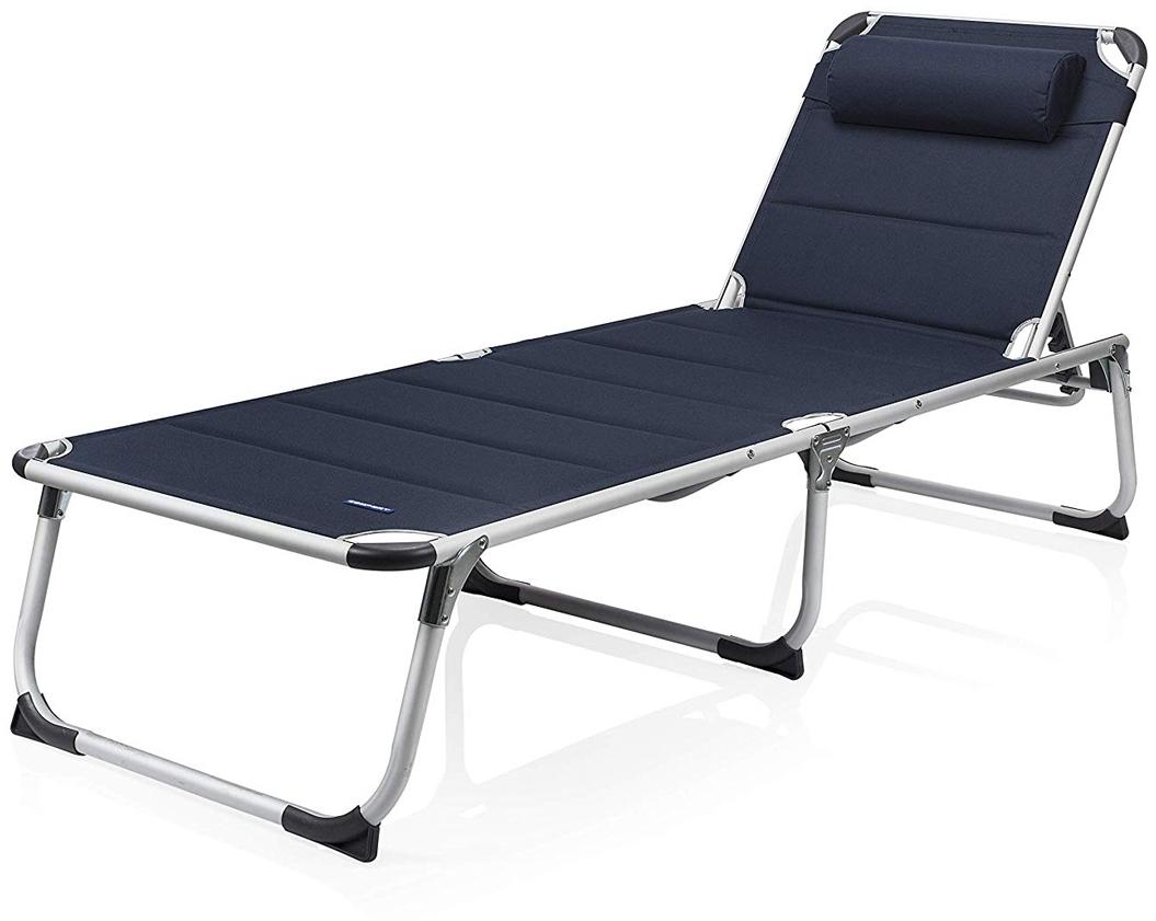 Stabile Gartenliege ROME in Navy Blau mit den Maßen 200 x 67 x 35 cm bietet Ihnen den perfekten Platz zum Entspannen. Genießen Sie die Sonne auf der gepolsterten Wellnessliege, die sich in 5 individuell verstellbare Positionen anpassen lässt. Mit einer Belastbarkeit von 120 kg und einem strapazierfähigen, UV-beständigen Polyestergewebe ist diese Liege ideal für Garten und Camping. **Highlights** - 5 individuell verstellbare Positionen für maximalen Komfort - Extra große Liegefläche von 67 x 200 cm - Belastbarkeit von 120 kg für Stabilität und Sicherheit - Strapazierfähiges, atmungsaktives und UV-beständiges Polyestergewebe - Inklusive abnehmbarem Kopfkissen für zusätzlichen Komfort **Produkteigenschaften** - Maße: 200 x 67 x 35 cm (L x B x H) - Gewicht: 6,3 kg - Material: pulverbeschichteter Aluminiumrahmen, Polyestergewebe - Farbe: Navy Blau - Kompaktes Packmaß von 83 x 66 x 17 cm für einfache Lagerung und Transport - Geeignet für den Garten, Campingurlaub und mehr **Lieferumfang** - 1 x Gartenliege ROME Navy Blau - 1 x abnehmbares Kopfkissen
